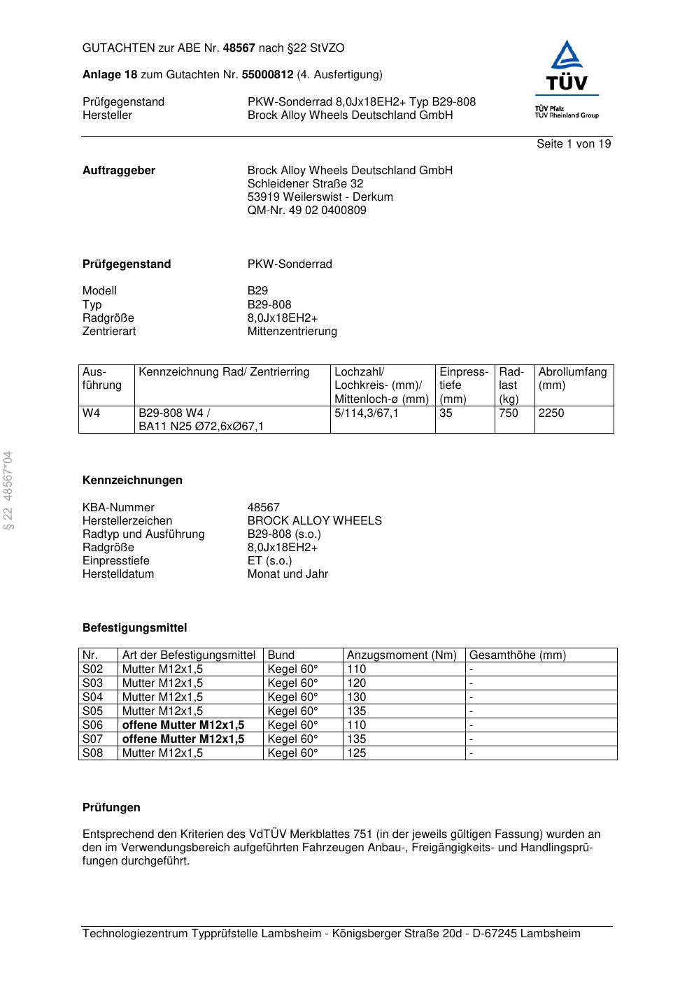 Dieses Gutachten (abe) bezieht sich auf die Alufelge Brock B29-80 8 in der Ausführung ET 0, Mittenloch 0 mm (KBA 48567). Im PDF findest du typischerweise zulässige Reifengrößen, Auflagen/Anbauhinweise und – je nach Dokument – Hinweise zur Eintragung.