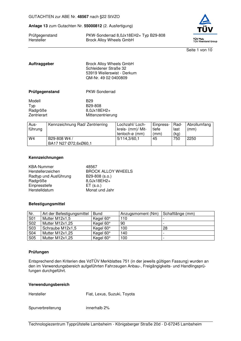 Dieses Gutachten (abe) bezieht sich auf die Alufelge Brock B29-80 8 in der Ausführung ET 0, Mittenloch 0 mm (KBA 48567). Im PDF findest du typischerweise zulässige Reifengrößen, Auflagen/Anbauhinweise und – je nach Dokument – Hinweise zur Eintragung.