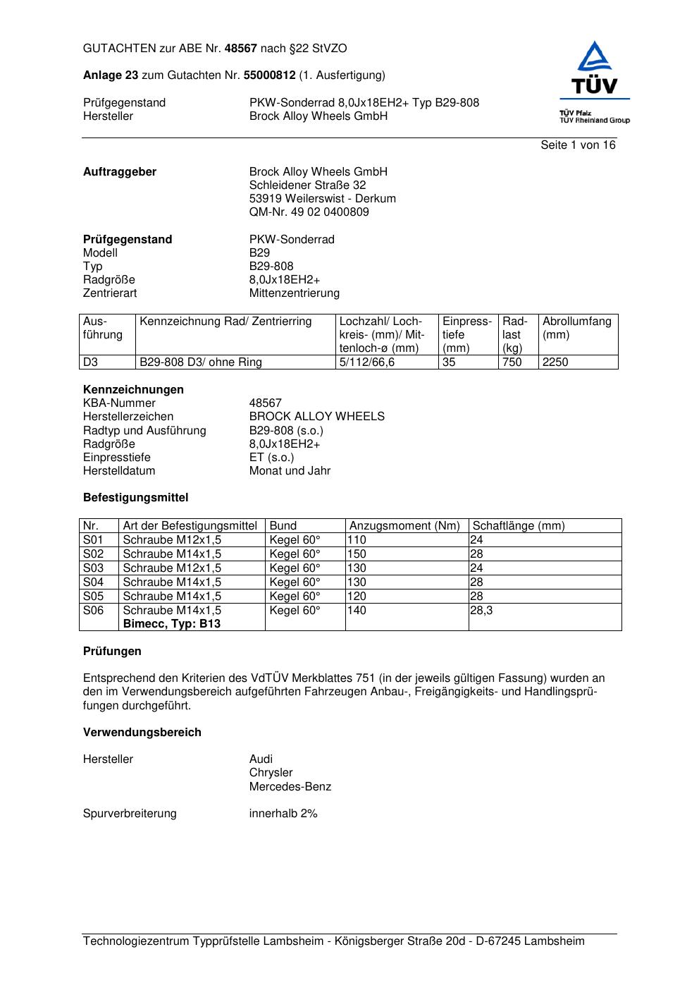 Dieses Gutachten (abe) bezieht sich auf die Alufelge Brock B29-80 8 in der Ausführung ET 0, Mittenloch 0 mm (KBA 48567). Im PDF findest du typischerweise zulässige Reifengrößen, Auflagen/Anbauhinweise und – je nach Dokument – Hinweise zur Eintragung.