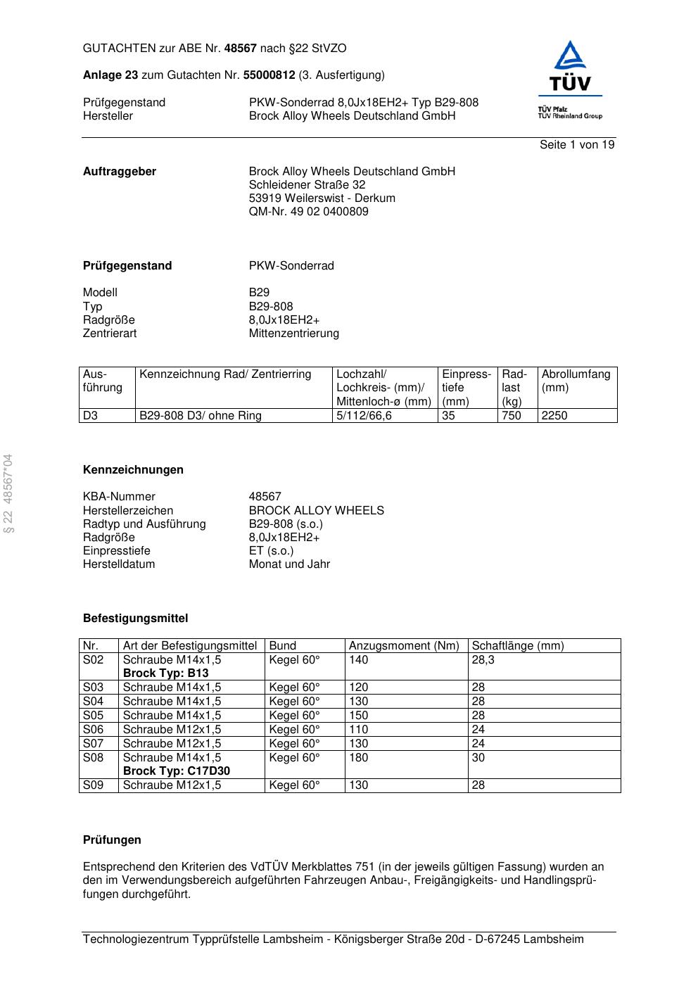 Dieses Gutachten (abe) bezieht sich auf die Alufelge Brock B29-80 8 in der Ausführung ET 0, Mittenloch 0 mm (KBA 48567). Im PDF findest du typischerweise zulässige Reifengrößen, Auflagen/Anbauhinweise und – je nach Dokument – Hinweise zur Eintragung.