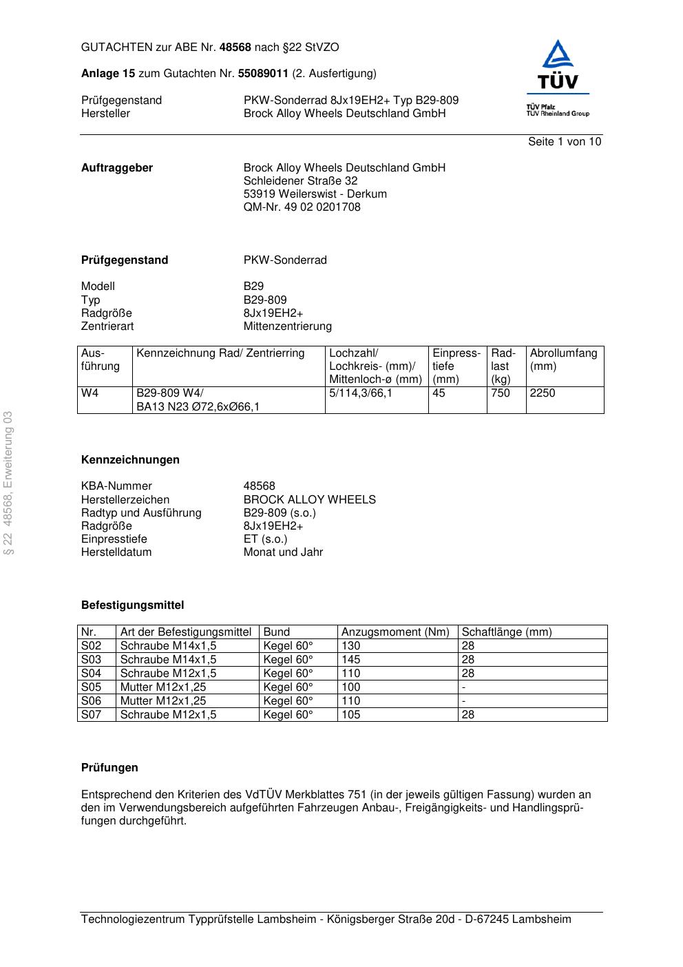 Dieses Gutachten (abe) bezieht sich auf die Alufelge Brock B29-809 in der Ausführung ET 0, Mittenloch 0 mm (KBA 48568). Im PDF findest du typischerweise zulässige Reifengrößen, Auflagen/Anbauhinweise und – je nach Dokument – Hinweise zur Eintragung.