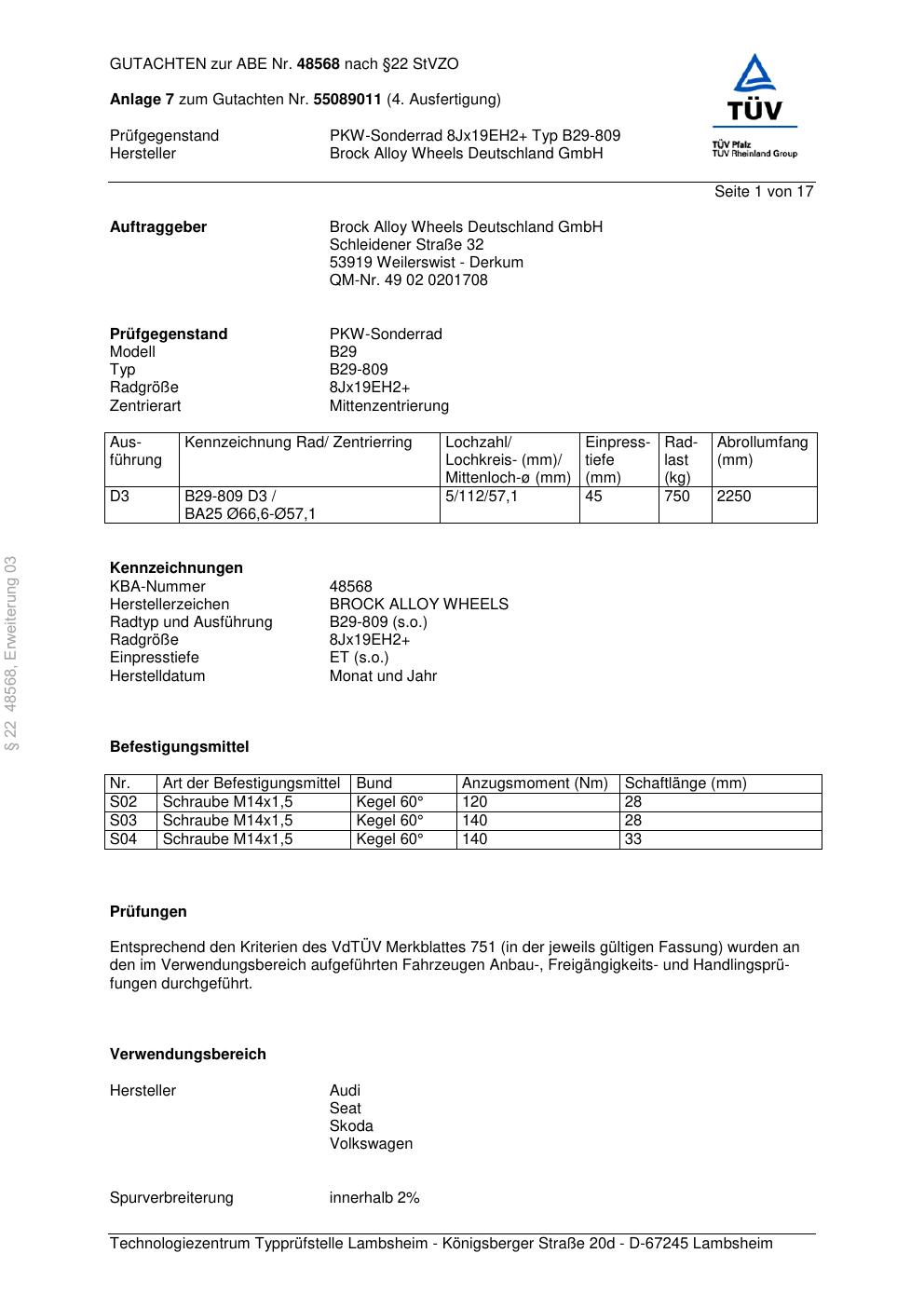 Dieses Gutachten (abe) bezieht sich auf die Alufelge Brock B29-809 in der Ausführung ET 0, Mittenloch 0 mm (KBA 48568). Im PDF findest du typischerweise zulässige Reifengrößen, Auflagen/Anbauhinweise und – je nach Dokument – Hinweise zur Eintragung.