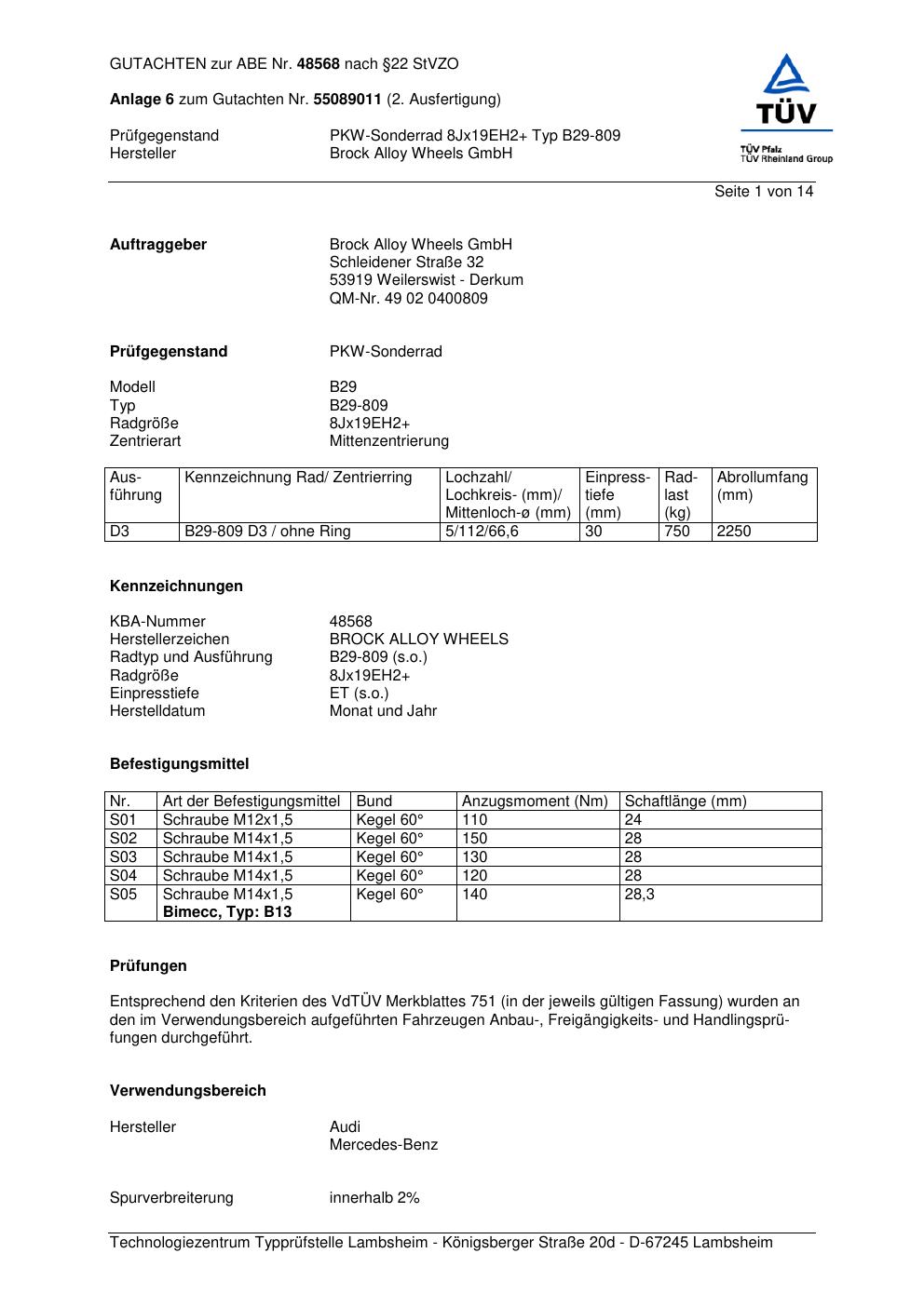 Dieses Gutachten (abe) bezieht sich auf die Alufelge Brock B29-809 in der Ausführung ET 0, Mittenloch 0 mm (KBA 48568). Im PDF findest du typischerweise zulässige Reifengrößen, Auflagen/Anbauhinweise und – je nach Dokument – Hinweise zur Eintragung.