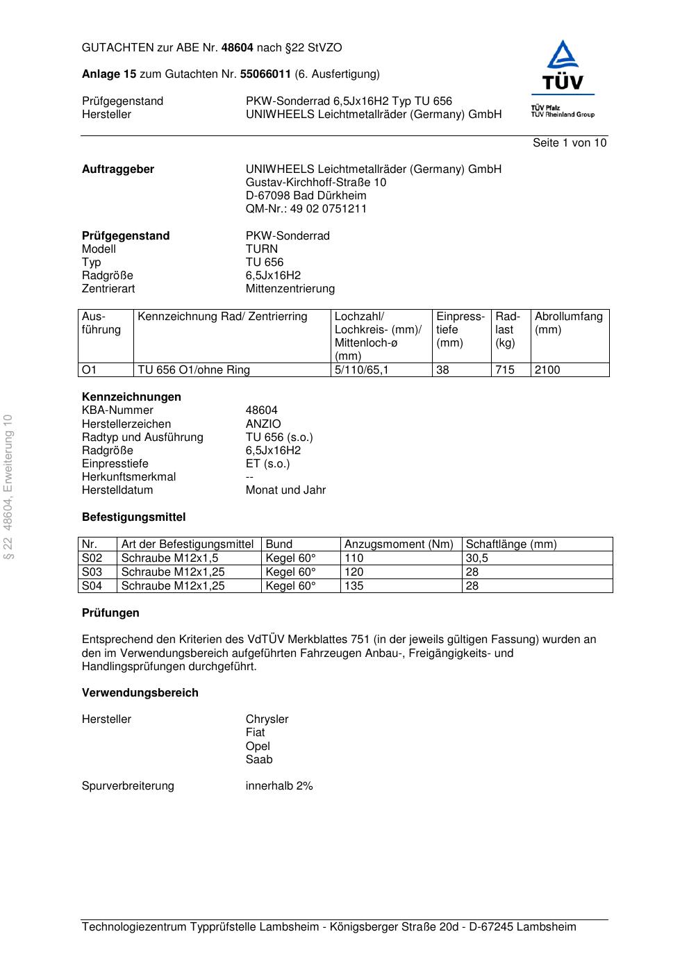Dieses Gutachten (abe) bezieht sich auf die Alufelge brand-anzio TU 656 in der Ausführung 6.5Jx16 ET 0, Mittenloch 0 mm (KBA 48604). Im PDF findest du typischerweise zulässige Reifengrößen, Auflagen/Anbauhinweise und – je nach Dokument – Hinweise zur Eintragung.
