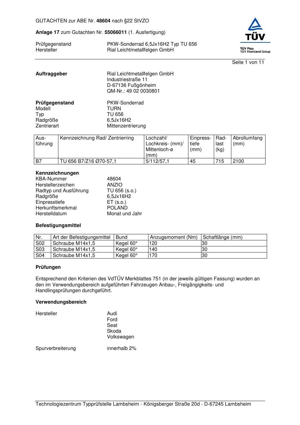 Dieses Gutachten (abe) bezieht sich auf die Alufelge brand-anzio TU 656 in der Ausführung 6.5Jx16 ET 0, Mittenloch 0 mm (KBA 48604). Im PDF findest du typischerweise zulässige Reifengrößen, Auflagen/Anbauhinweise und – je nach Dokument – Hinweise zur Eintragung.