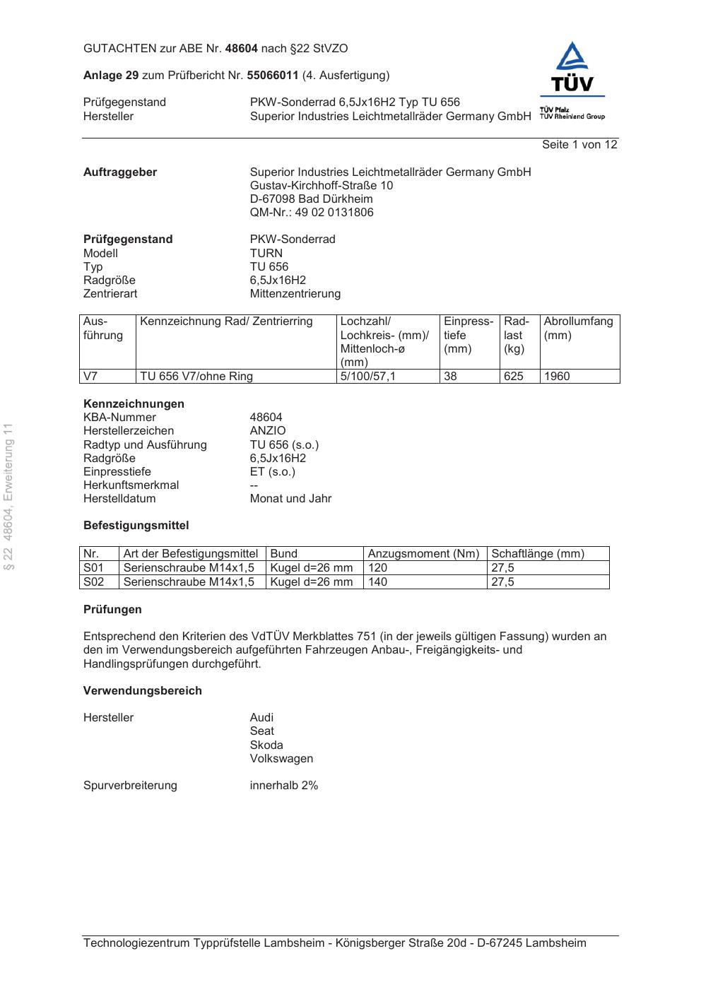 Dieses Gutachten (abe) bezieht sich auf die Alufelge brand-anzio TU 656 in der Ausführung 6.5Jx16 ET 0, Mittenloch 0 mm (KBA 48604). Im PDF findest du typischerweise zulässige Reifengrößen, Auflagen/Anbauhinweise und – je nach Dokument – Hinweise zur Eintragung.