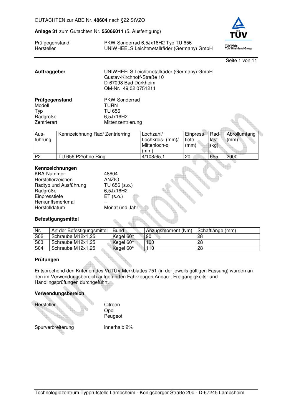 Dieses Gutachten (abe) bezieht sich auf die Alufelge brand-anzio TU 656 in der Ausführung 6.5Jx16 ET 0, Mittenloch 0 mm (KBA 48604). Im PDF findest du typischerweise zulässige Reifengrößen, Auflagen/Anbauhinweise und – je nach Dokument – Hinweise zur Eintragung.