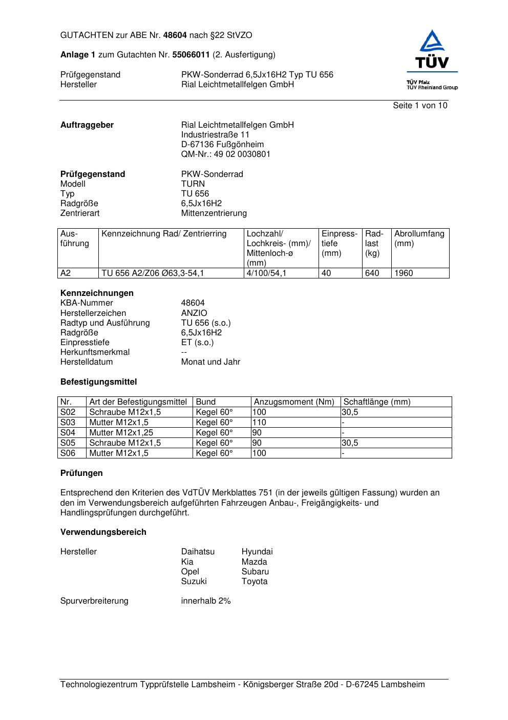 Dieses Gutachten (abe) bezieht sich auf die Alufelge brand-anzio TU 656 in der Ausführung 6.5Jx16 ET 0, Mittenloch 0 mm (KBA 48604). Im PDF findest du typischerweise zulässige Reifengrößen, Auflagen/Anbauhinweise und – je nach Dokument – Hinweise zur Eintragung.