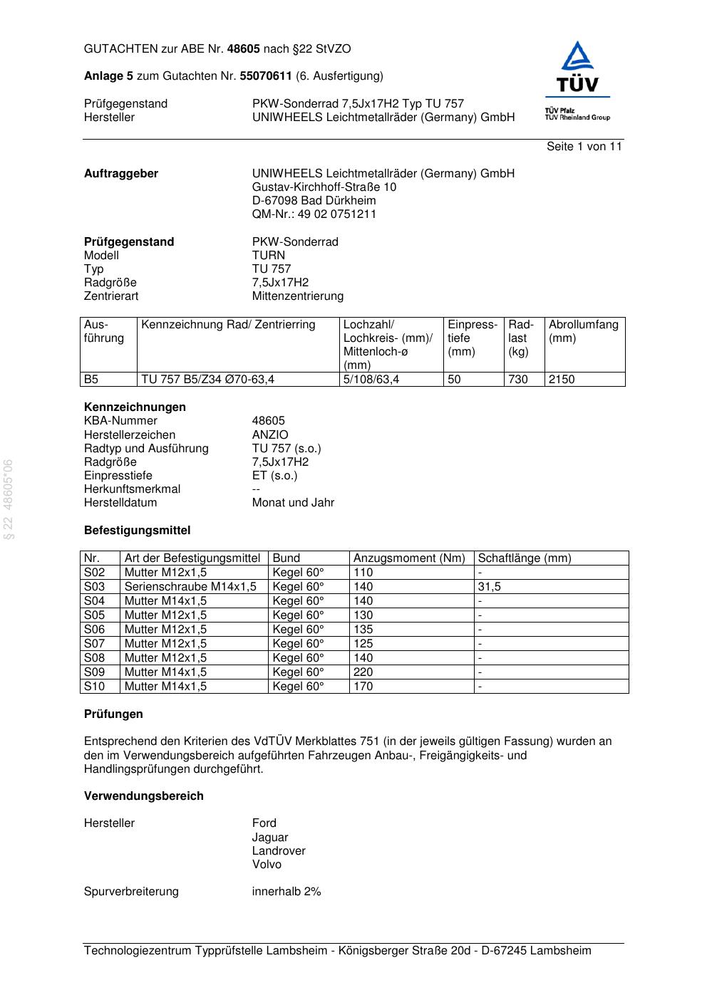 Dieses Gutachten (abe) bezieht sich auf die Alufelge brand-anzio TU 757 in der Ausführung 7.5Jx17 ET 0, Mittenloch 0 mm (KBA 48605). Im PDF findest du typischerweise zulässige Reifengrößen, Auflagen/Anbauhinweise und – je nach Dokument – Hinweise zur Eintragung.