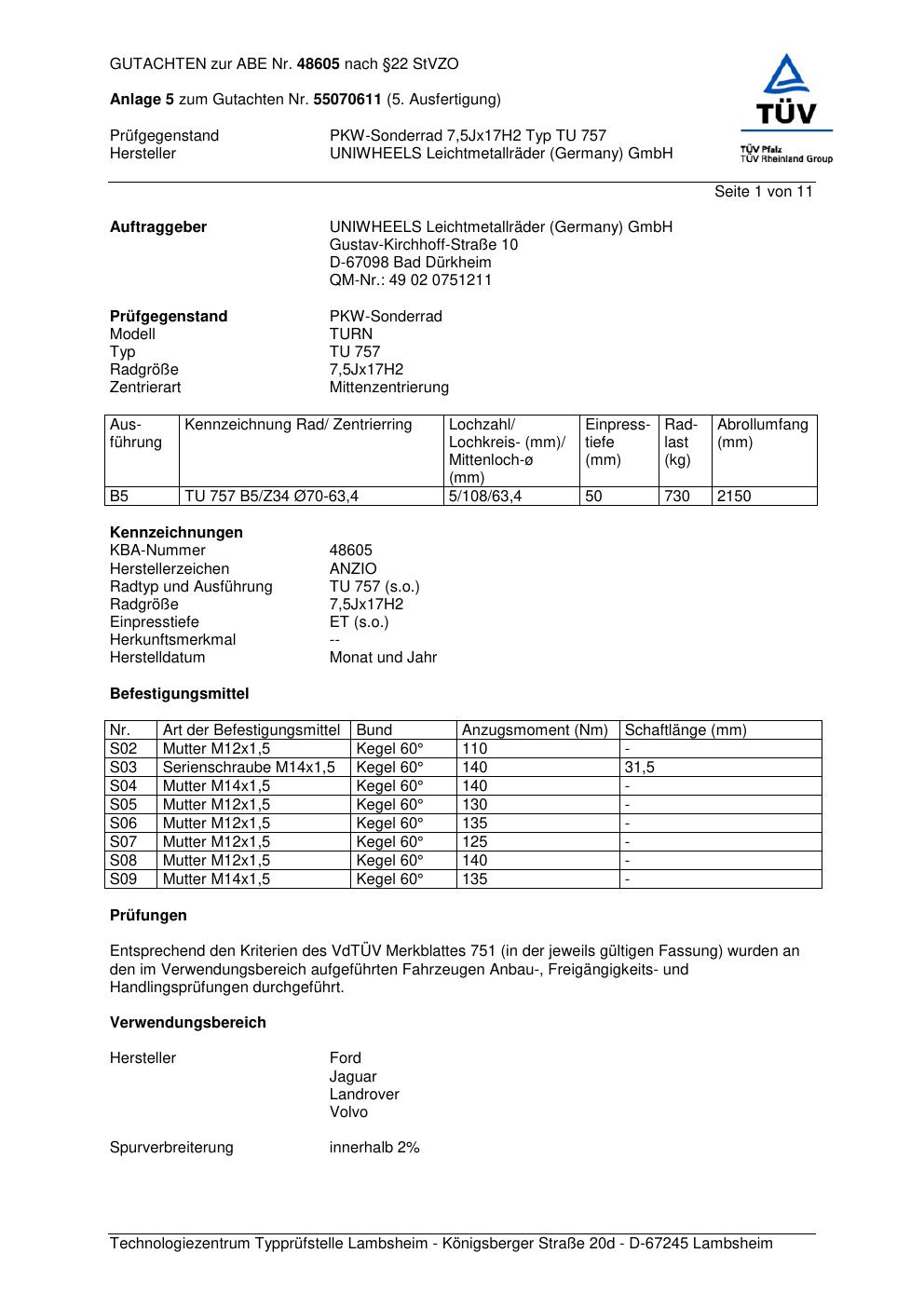 Dieses Gutachten (abe) bezieht sich auf die Alufelge brand-anzio TU 757 in der Ausführung 7.5Jx17 ET 0, Mittenloch 0 mm (KBA 48605). Im PDF findest du typischerweise zulässige Reifengrößen, Auflagen/Anbauhinweise und – je nach Dokument – Hinweise zur Eintragung.