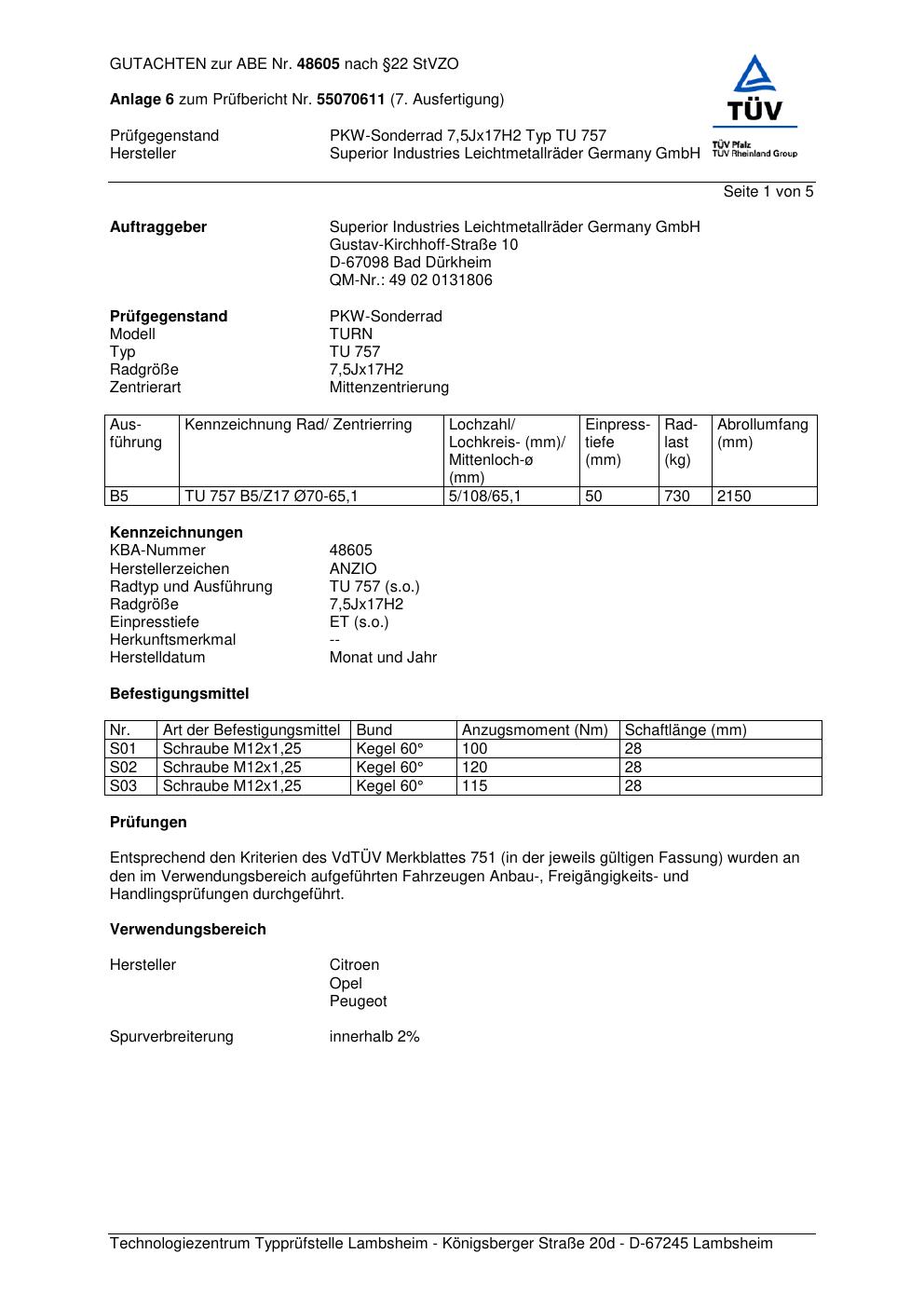 Dieses Gutachten (abe) bezieht sich auf die Alufelge brand-anzio TU 757 in der Ausführung 7.5Jx17 ET 0, Mittenloch 0 mm (KBA 48605). Im PDF findest du typischerweise zulässige Reifengrößen, Auflagen/Anbauhinweise und – je nach Dokument – Hinweise zur Eintragung.