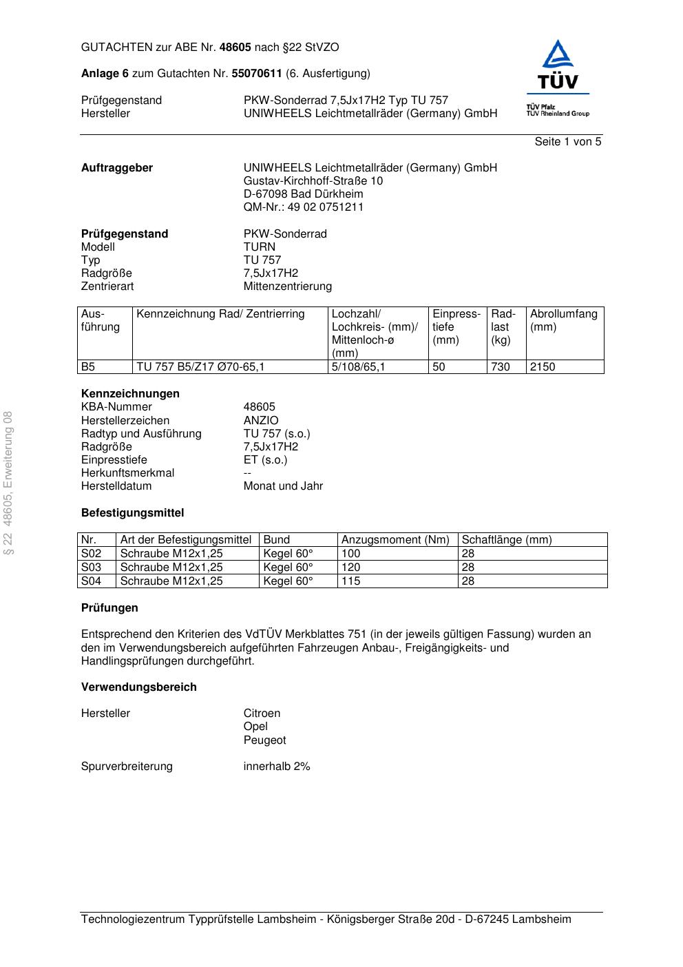 Dieses Gutachten (abe) bezieht sich auf die Alufelge brand-anzio TU 757 in der Ausführung 7.5Jx17 ET 0, Mittenloch 0 mm (KBA 48605). Im PDF findest du typischerweise zulässige Reifengrößen, Auflagen/Anbauhinweise und – je nach Dokument – Hinweise zur Eintragung.