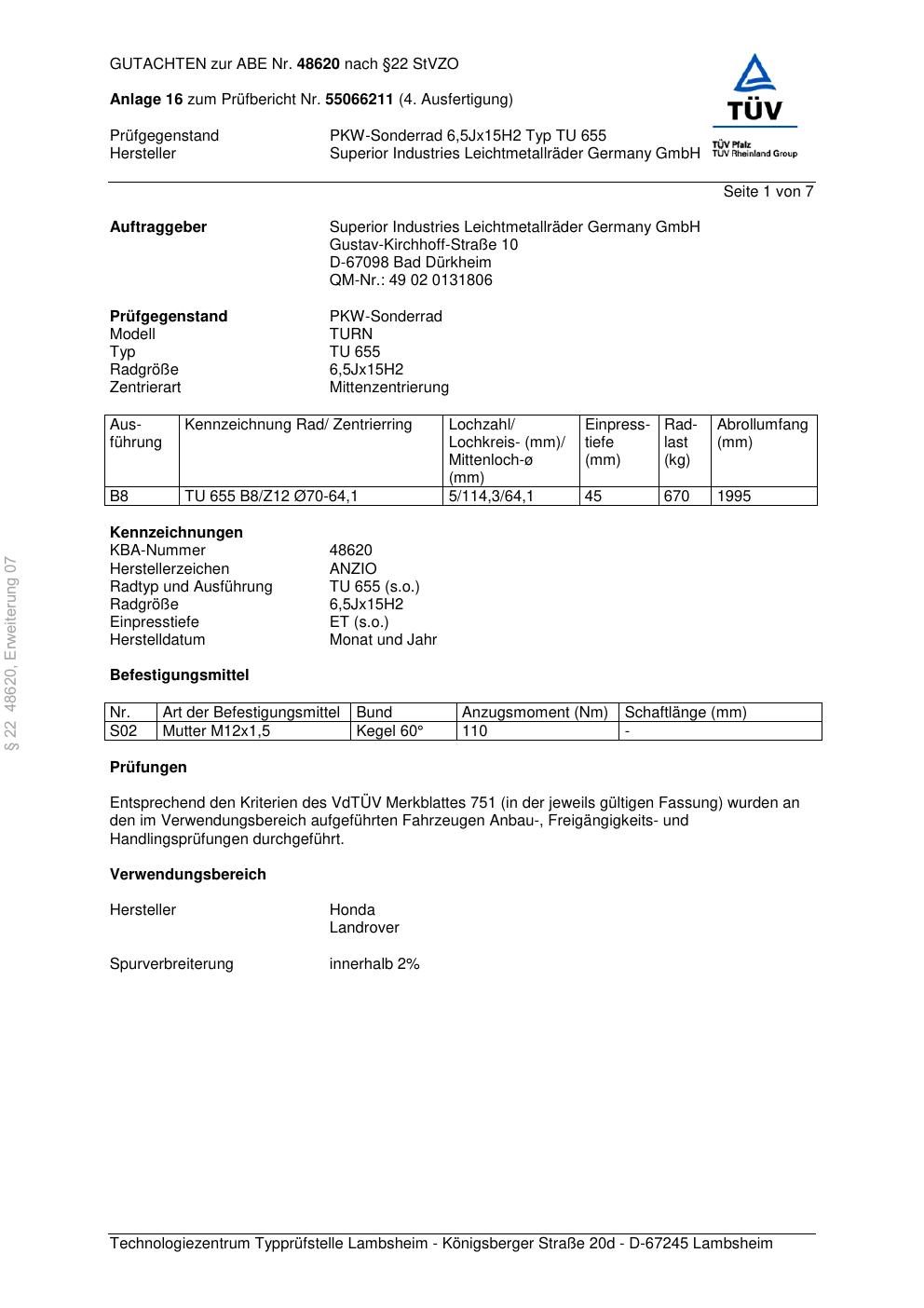 Dieses Gutachten (abe) bezieht sich auf die Alufelge brand-anzio TU 655 in der Ausführung 6.5Jx15 ET 0, Mittenloch 0 mm (KBA 48620). Im PDF findest du typischerweise zulässige Reifengrößen, Auflagen/Anbauhinweise und – je nach Dokument – Hinweise zur Eintragung.