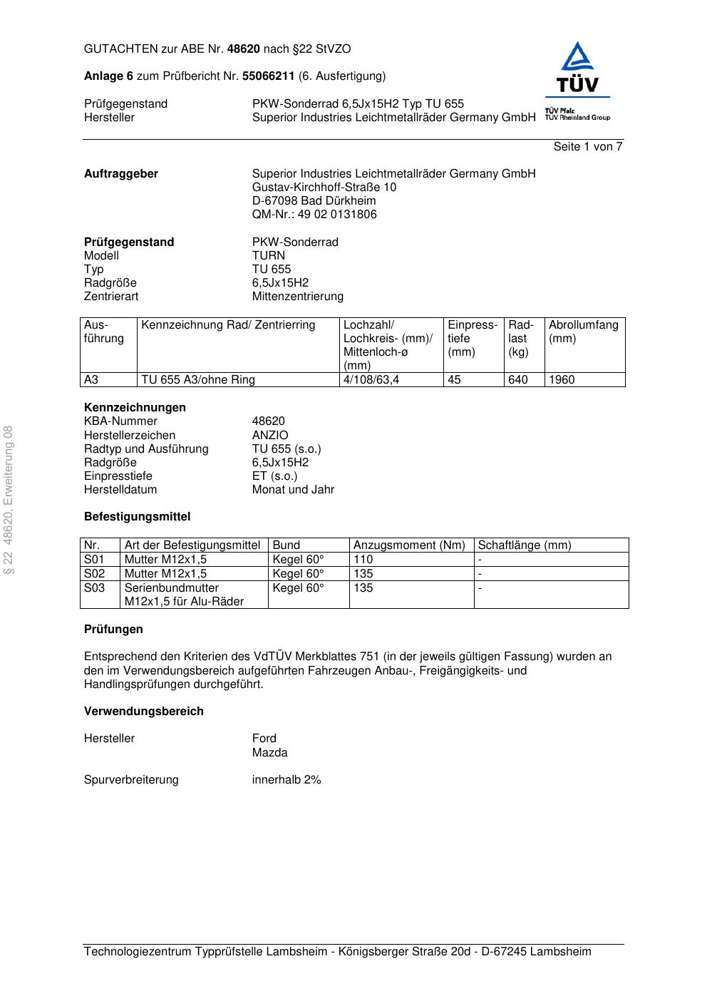 Dieses Gutachten (abe) bezieht sich auf die Alufelge brand-anzio TU 655 in der Ausführung 6.5Jx15 ET 0, Mittenloch 0 mm (KBA 48620). Im PDF findest du typischerweise zulässige Reifengrößen, Auflagen/Anbauhinweise und – je nach Dokument – Hinweise zur Eintragung.