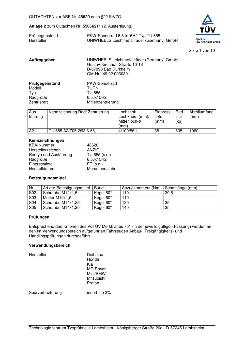 Dieses Gutachten (abe) bezieht sich auf die Alufelge brand-anzio TU 655 in der Ausführung 6.5Jx15 ET 0, Mittenloch 0 mm (KBA 48620). Im PDF findest du typischerweise zulässige Reifengrößen, Auflagen/Anbauhinweise und – je nach Dokument – Hinweise zur Eintragung.