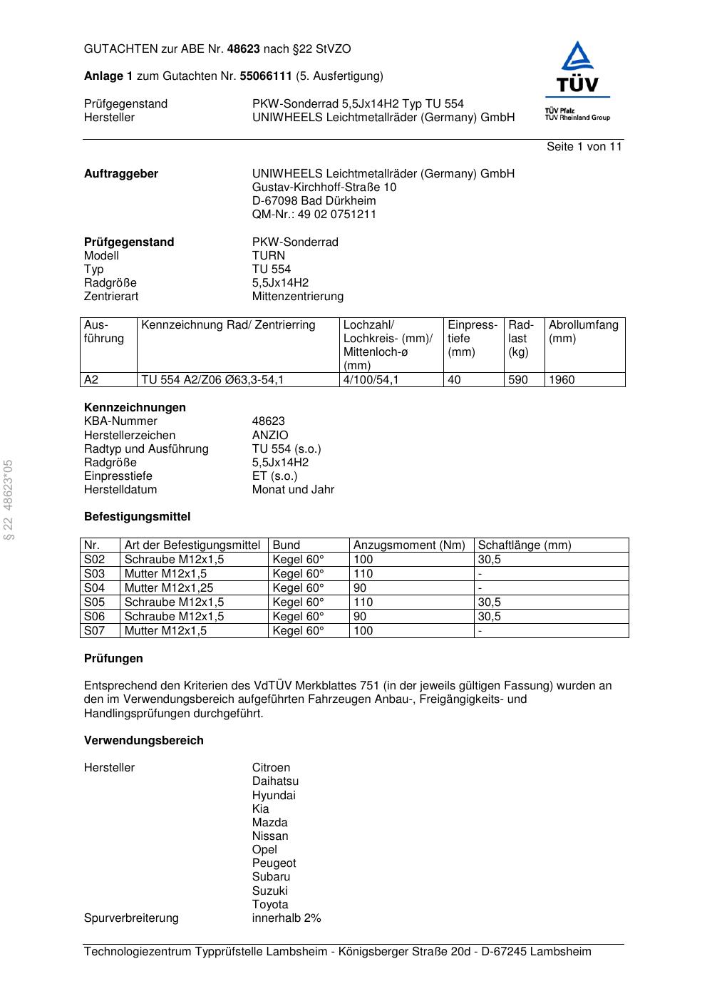 Dieses Gutachten (abe) bezieht sich auf die Alufelge brand-anzio TU 554 in der Ausführung 5.5Jx14 ET 0, Mittenloch 0 mm (KBA 48623). Im PDF findest du typischerweise zulässige Reifengrößen, Auflagen/Anbauhinweise und – je nach Dokument – Hinweise zur Eintragung.