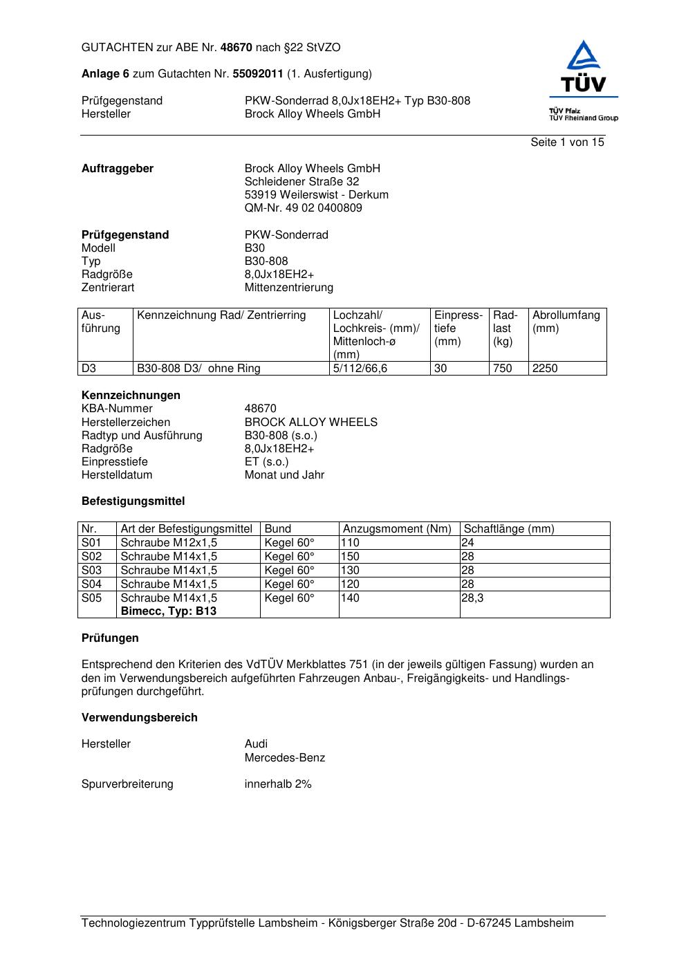 Dieses Gutachten (abe) bezieht sich auf die Alufelge Brock B30-80 8 in der Ausführung ET 0, Mittenloch 0 mm (KBA 48670). Im PDF findest du typischerweise zulässige Reifengrößen, Auflagen/Anbauhinweise und – je nach Dokument – Hinweise zur Eintragung.