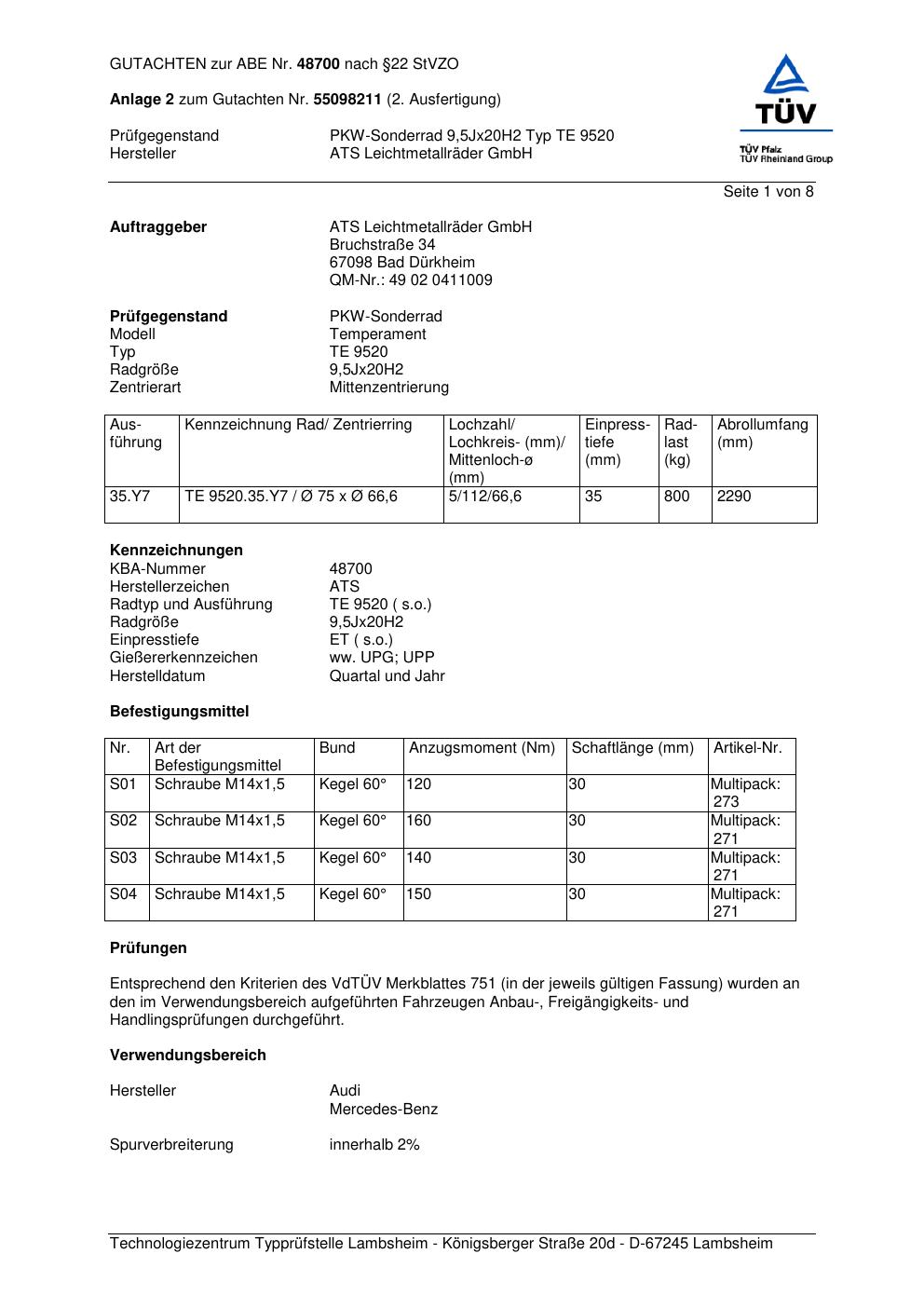 Felgengutachten / abe für Alufelgen ATS TE 9520 (9.5Jx2 ET 0, Mittenloch 0 mm) mit KBA 48700 (Zertifikatsnummer 48700). Hier kostenlos als PDF herunterladen. Der Download-Link ist 24 Stunden gültig und kann bis zu zwei Mal verwendet werden.