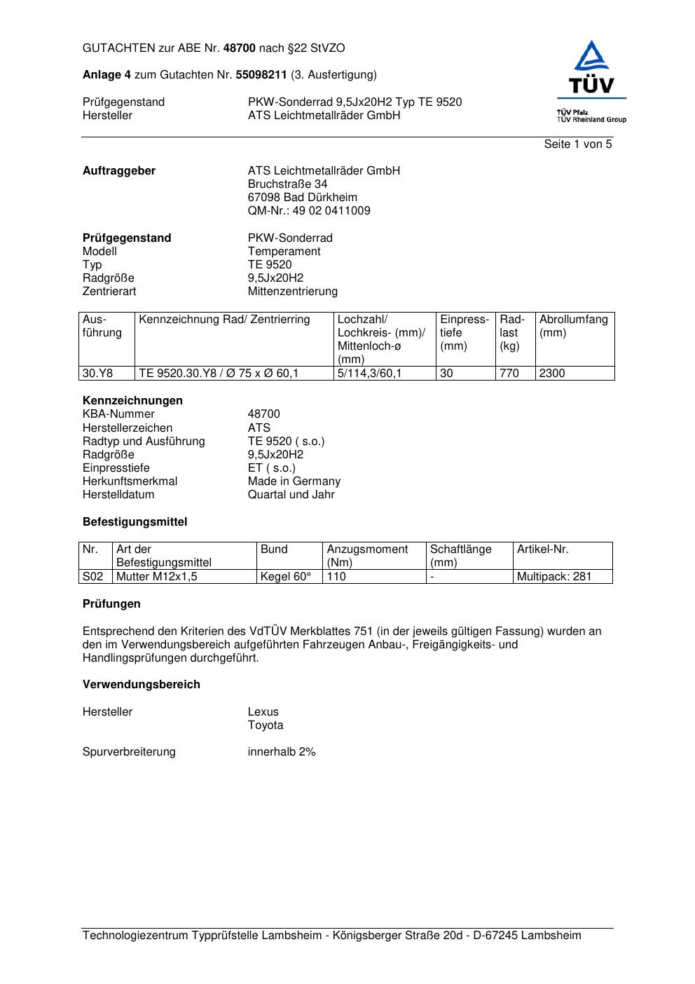 Dieses Gutachten (abe) bezieht sich auf die Alufelge ATS TE 9520 in der Ausführung 9.5Jx2 ET 0, Mittenloch 0 mm (KBA 48700). Im PDF findest du typischerweise zulässige Reifengrößen, Auflagen/Anbauhinweise und – je nach Dokument – Hinweise zur Eintragung.