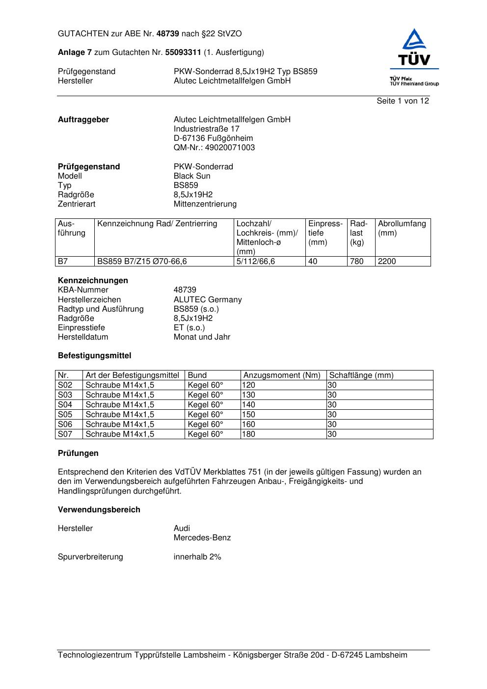 Dieses Gutachten (abe) bezieht sich auf die Alufelge ALUTEC BS859 in der Ausführung 8.5Jx19 ET 0, Mittenloch 0 mm (KBA 48739). Im PDF findest du typischerweise zulässige Reifengrößen, Auflagen/Anbauhinweise und – je nach Dokument – Hinweise zur Eintragung.