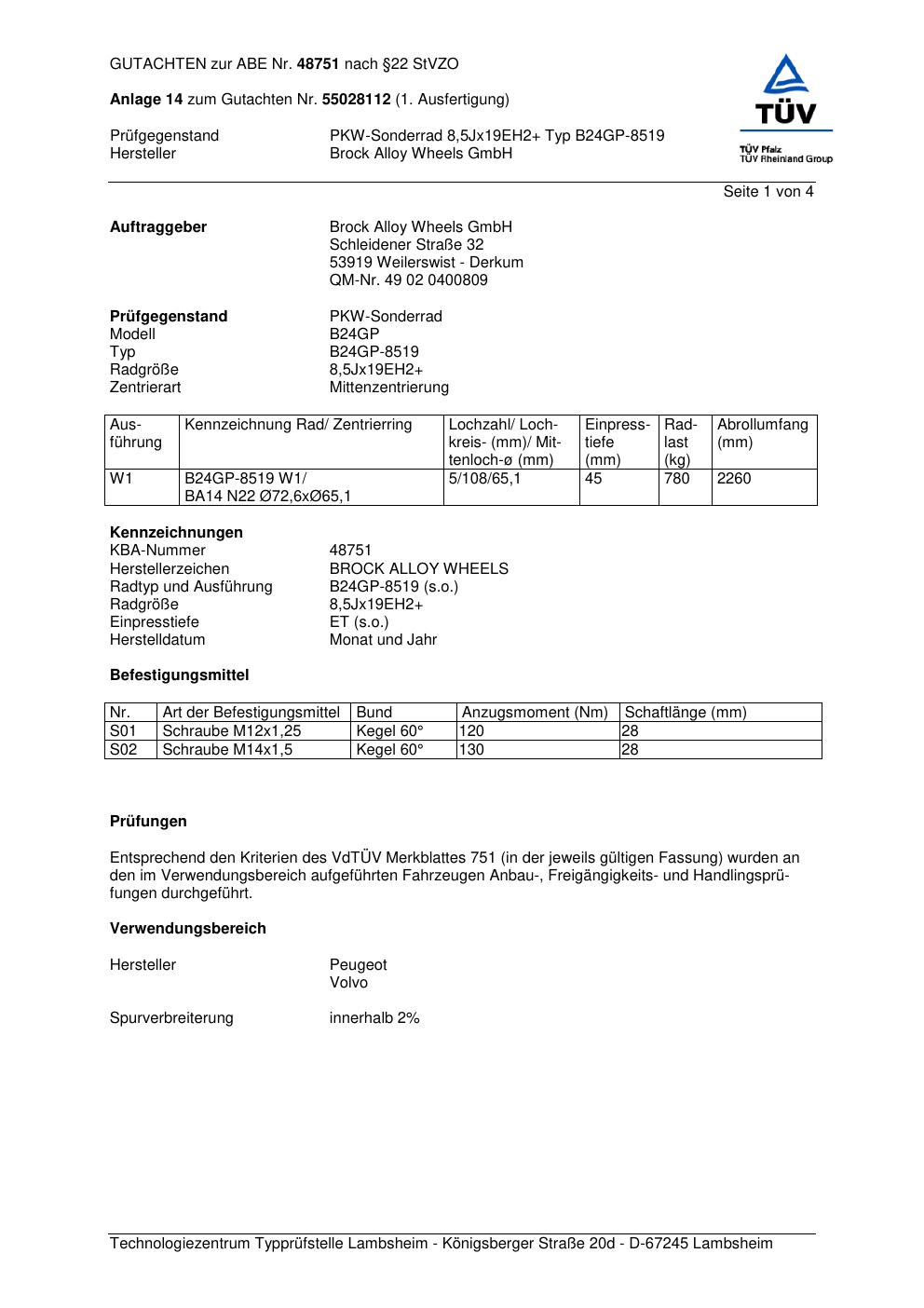 Dieses Gutachten (abe) bezieht sich auf die Alufelge Brock B24GP- 8519 in der Ausführung ET 0, Mittenloch 0 mm (KBA 48751). Im PDF findest du typischerweise zulässige Reifengrößen, Auflagen/Anbauhinweise und – je nach Dokument – Hinweise zur Eintragung.