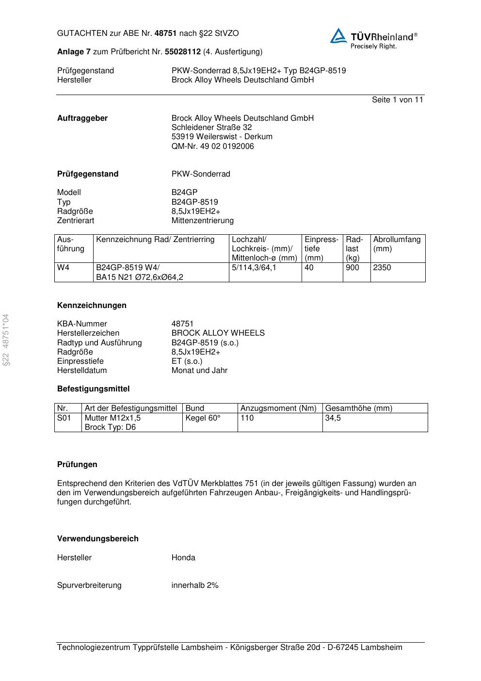 Dieses Gutachten (abe) bezieht sich auf die Alufelge Brock B24GP- 8519 in der Ausführung ET 0, Mittenloch 0 mm (KBA 48751). Im PDF findest du typischerweise zulässige Reifengrößen, Auflagen/Anbauhinweise und – je nach Dokument – Hinweise zur Eintragung.
