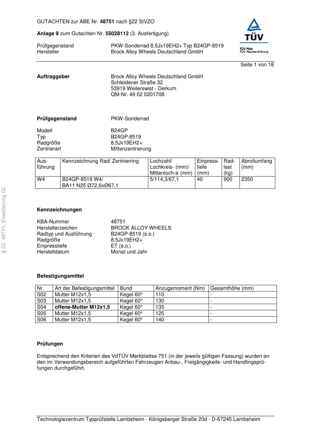 Dieses Gutachten (abe) bezieht sich auf die Alufelge Brock B24GP- 8519 in der Ausführung ET 0, Mittenloch 0 mm (KBA 48751). Im PDF findest du typischerweise zulässige Reifengrößen, Auflagen/Anbauhinweise und – je nach Dokument – Hinweise zur Eintragung.