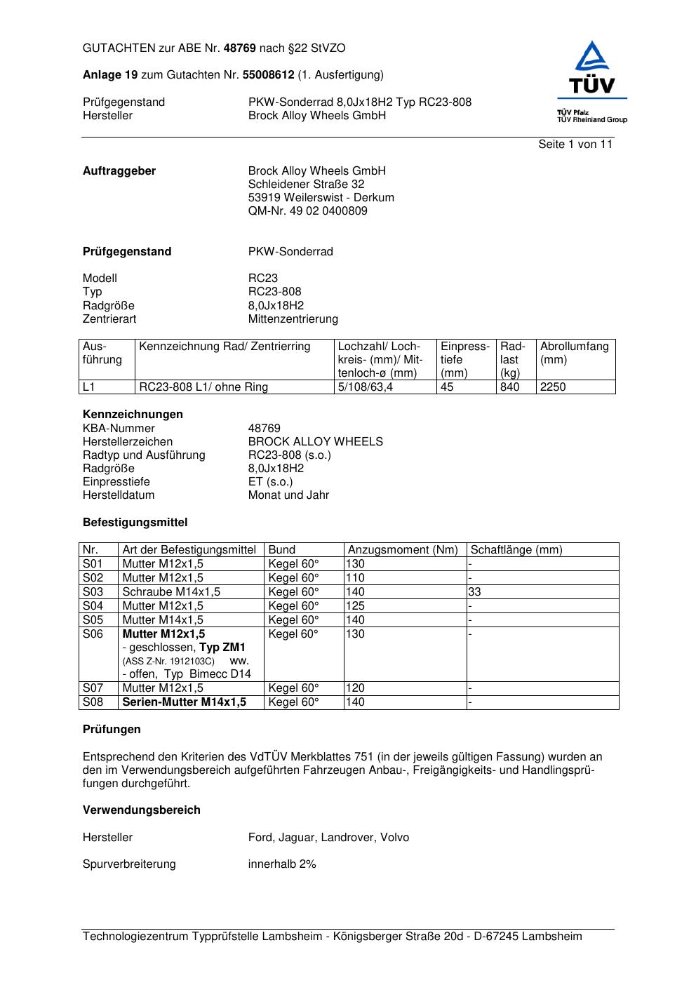 Dieses Gutachten (abe) bezieht sich auf die Alufelge Brock RC23-808 in der Ausführung 8Jx18 ET 0, Mittenloch 0 mm (KBA 48769). Im PDF findest du typischerweise zulässige Reifengrößen, Auflagen/Anbauhinweise und – je nach Dokument – Hinweise zur Eintragung.