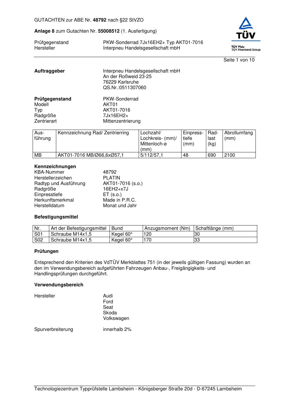 Felgengutachten / abe für Alufelgen Platin AKT01-70 16 (70Jx2 ET 0, Mittenloch 0 mm) mit KBA 48792 (Zertifikatsnummer 48792). Hier kostenlos als PDF herunterladen. Der Download-Link ist 24 Stunden gültig und kann bis zu zwei Mal verwendet werden.