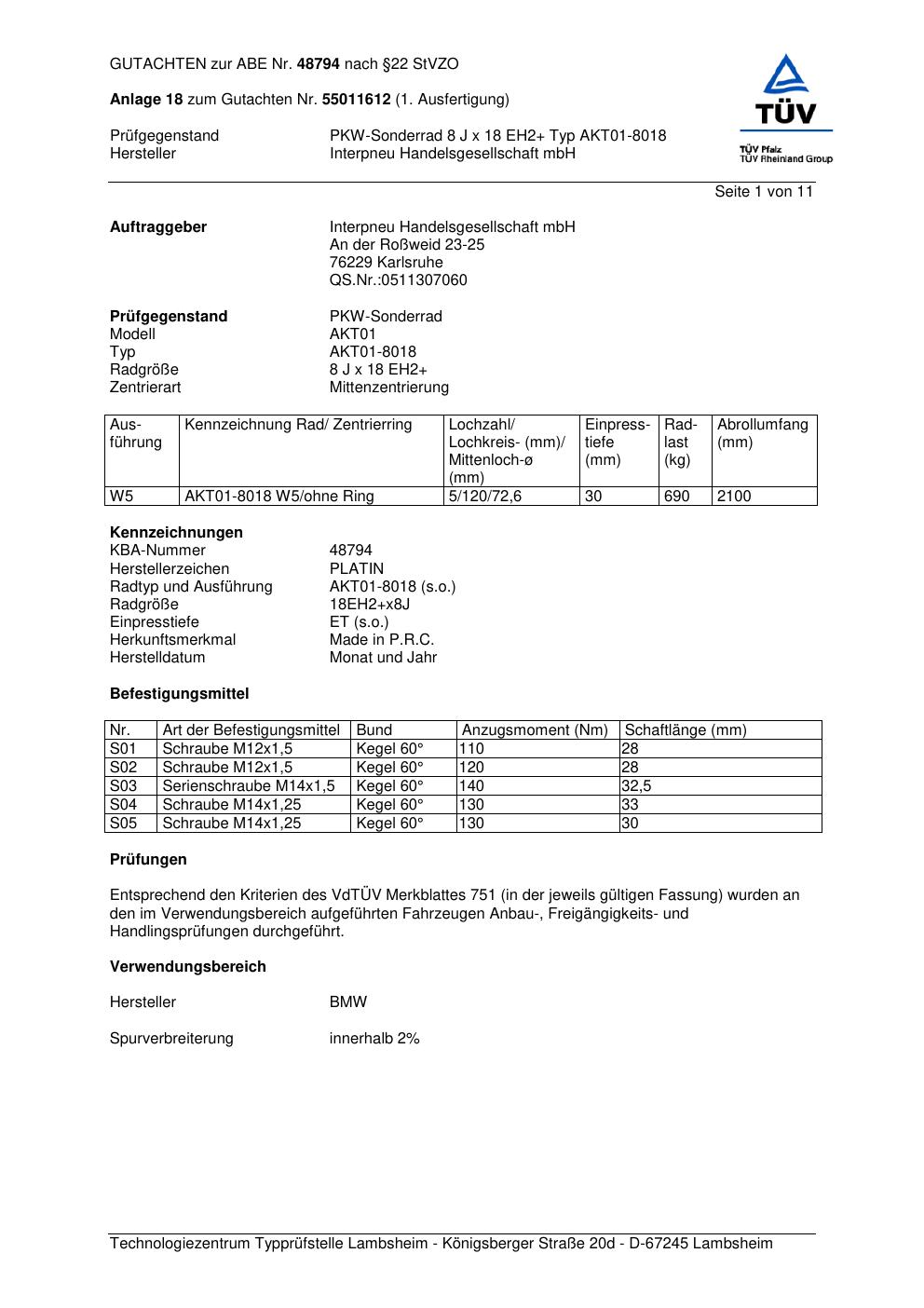 Felgengutachten / abe für Alufelgen Platin AKT0 1-8018 (8Jx18 ET 0, Mittenloch 0 mm) mit KBA 48794 (Zertifikatsnummer 48794). Hier kostenlos als PDF herunterladen. Der Download-Link ist 24 Stunden gültig und kann bis zu zwei Mal verwendet werden.