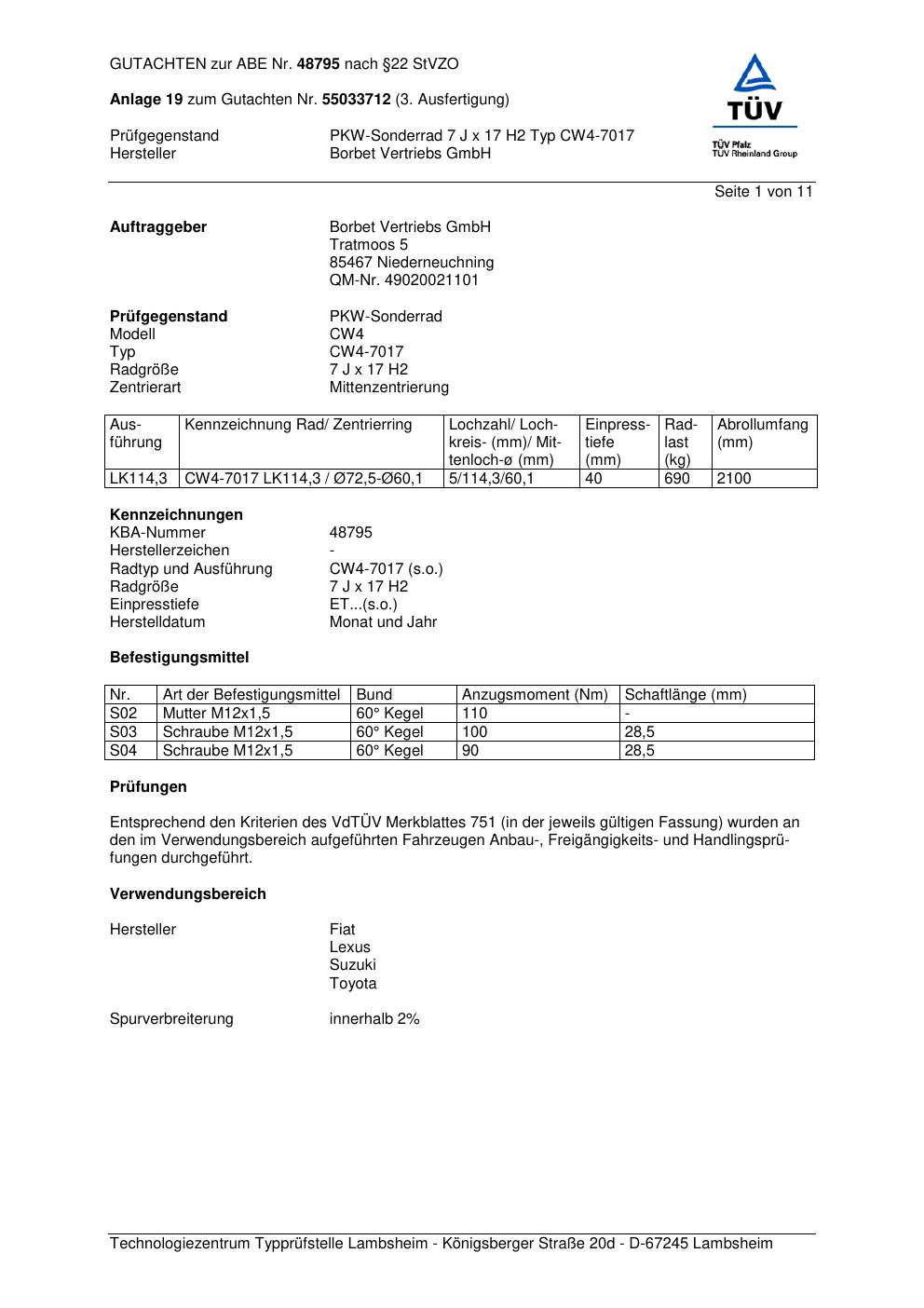 Dieses Gutachten (abe) bezieht sich auf die Alufelge Borbet CW4-70 17 in der Ausführung 7Jx17 ET 0, Mittenloch 0 mm (KBA 48795). Im PDF findest du typischerweise zulässige Reifengrößen, Auflagen/Anbauhinweise und – je nach Dokument – Hinweise zur Eintragung.