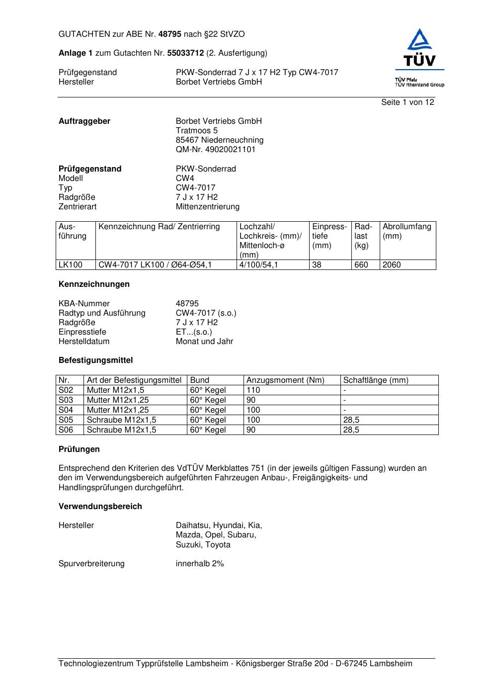 Dieses Gutachten (abe) bezieht sich auf die Alufelge Borbet CW4-70 17 in der Ausführung 7Jx17 ET 0, Mittenloch 0 mm (KBA 48795). Im PDF findest du typischerweise zulässige Reifengrößen, Auflagen/Anbauhinweise und – je nach Dokument – Hinweise zur Eintragung.