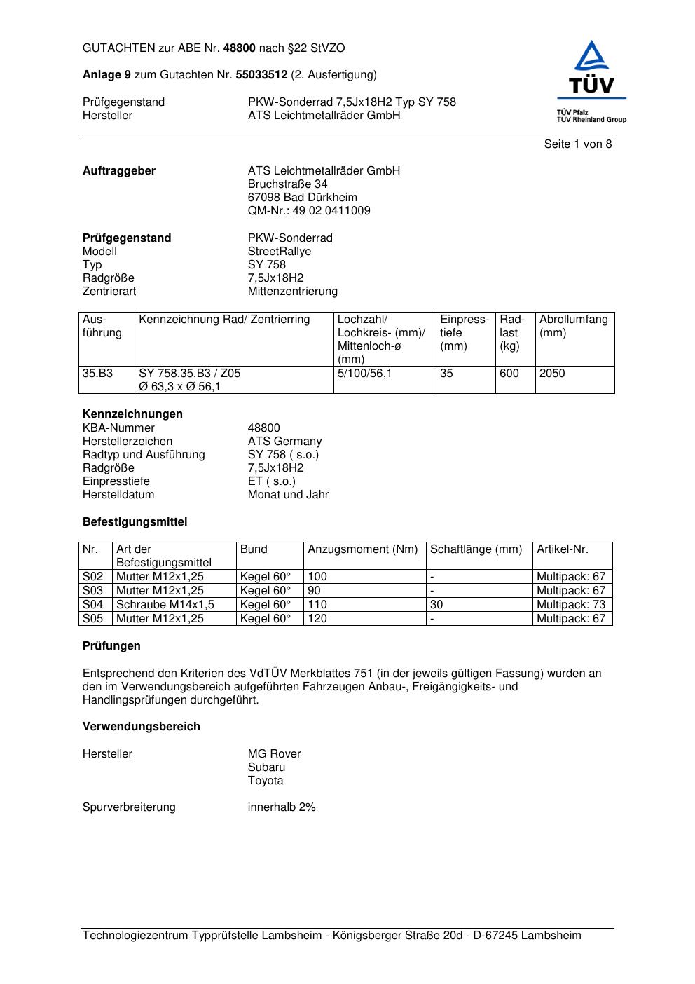 Dieses Gutachten (abe) bezieht sich auf die Alufelge ATS SY 758 in der Ausführung 7.5Jx18 ET 0, Mittenloch 0 mm (KBA 48800). Im PDF findest du typischerweise zulässige Reifengrößen, Auflagen/Anbauhinweise und – je nach Dokument – Hinweise zur Eintragung.