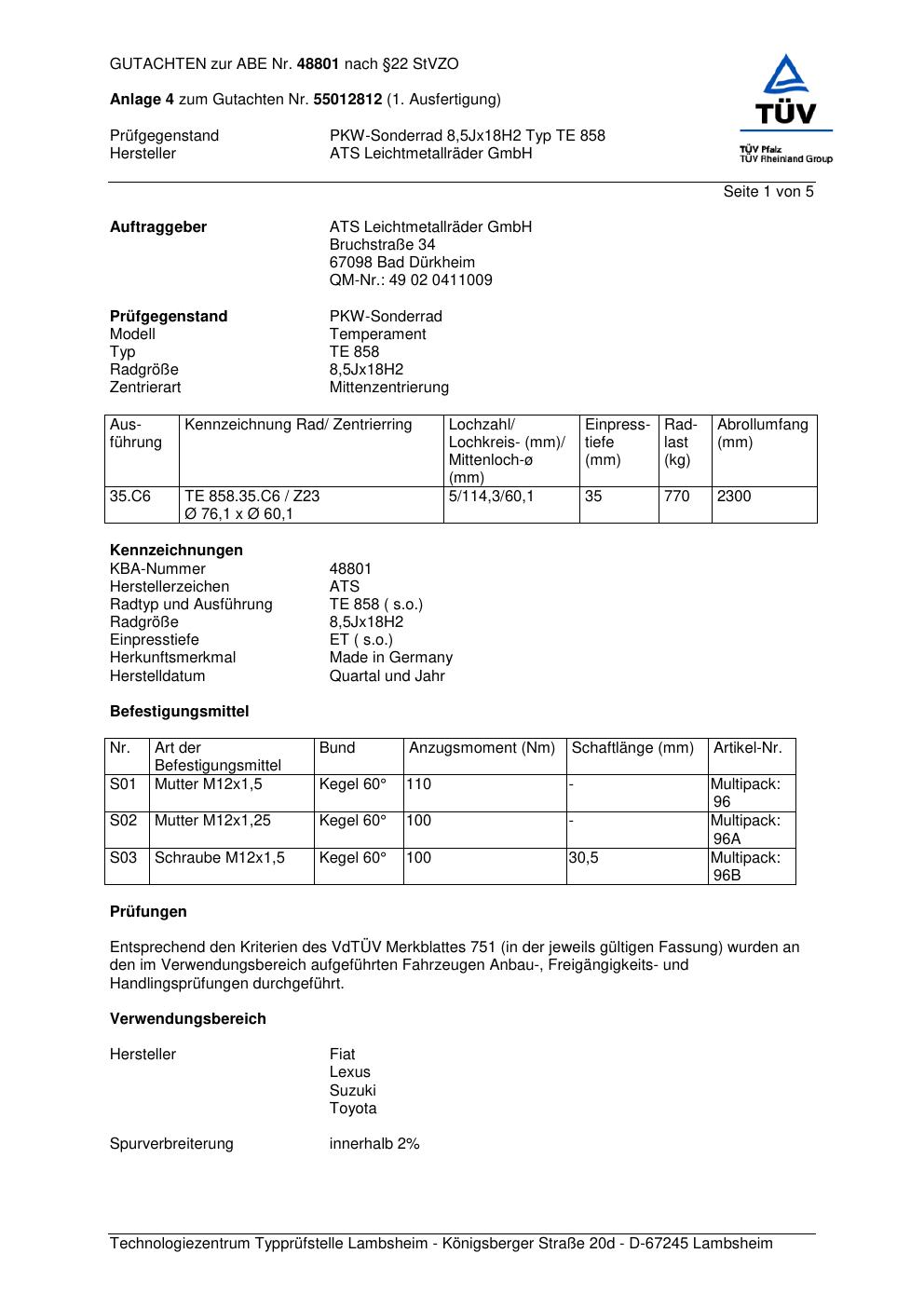 Dieses Gutachten (abe) bezieht sich auf die Alufelge ATS TE 858 in der Ausführung 8.5Jx18 ET 0, Mittenloch 0 mm (KBA 48801). Im PDF findest du typischerweise zulässige Reifengrößen, Auflagen/Anbauhinweise und – je nach Dokument – Hinweise zur Eintragung.