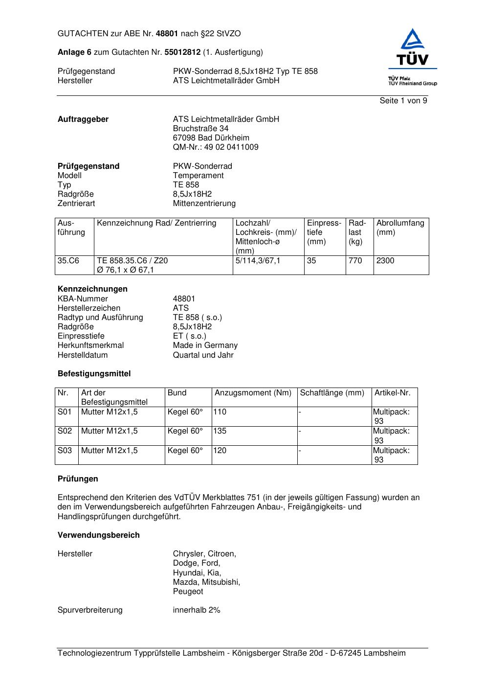 Dieses Gutachten (abe) bezieht sich auf die Alufelge ATS TE 858 in der Ausführung 8.5Jx18 ET 0, Mittenloch 0 mm (KBA 48801). Im PDF findest du typischerweise zulässige Reifengrößen, Auflagen/Anbauhinweise und – je nach Dokument – Hinweise zur Eintragung.