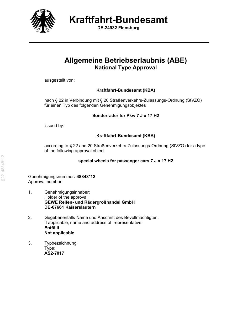 Dieses Gutachten (abe) bezieht sich auf die Alufelge ATS UN8080 in der Ausführung 7Jx17 ET 0, Mittenloch 0 mm (KBA 48848). Im PDF findest du typischerweise zulässige Reifengrößen, Auflagen/Anbauhinweise und – je nach Dokument – Hinweise zur Eintragung.