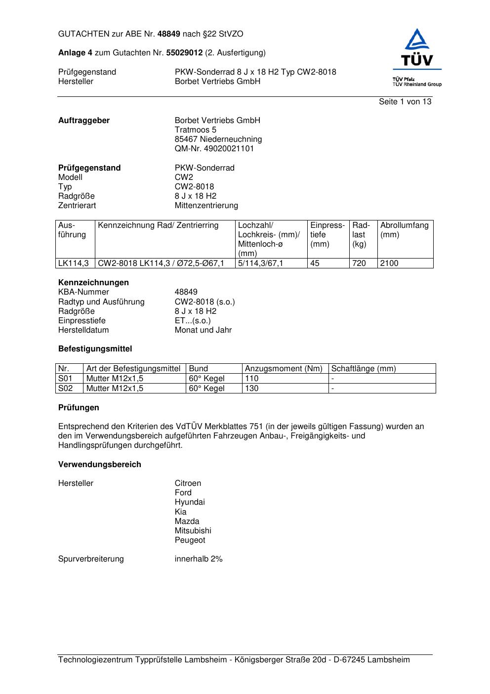 Dieses Gutachten (abe) bezieht sich auf die Alufelge Borbet CW2-80 18 in der Ausführung 8Jx18 ET 0, Mittenloch 0 mm (KBA 48849). Im PDF findest du typischerweise zulässige Reifengrößen, Auflagen/Anbauhinweise und – je nach Dokument – Hinweise zur Eintragung.