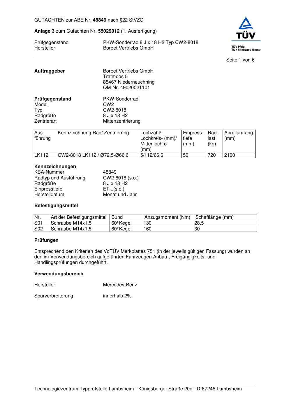 Dieses Gutachten (abe) bezieht sich auf die Alufelge Borbet CW2-80 18 in der Ausführung 8Jx18 ET 0, Mittenloch 0 mm (KBA 48849). Im PDF findest du typischerweise zulässige Reifengrößen, Auflagen/Anbauhinweise und – je nach Dokument – Hinweise zur Eintragung.