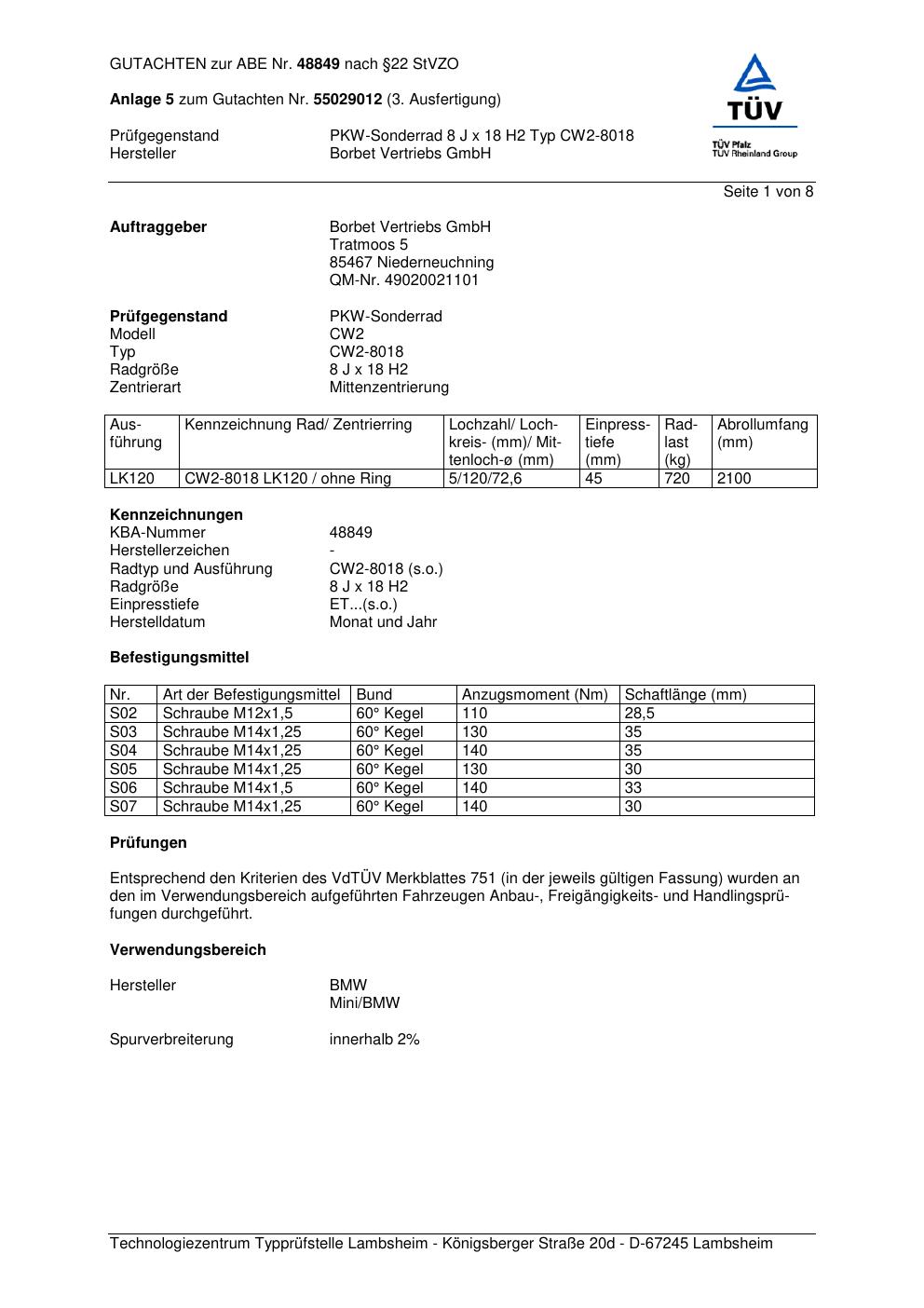 Dieses Gutachten (abe) bezieht sich auf die Alufelge Borbet CW2-80 18 in der Ausführung 8Jx18 ET 0, Mittenloch 0 mm (KBA 48849). Im PDF findest du typischerweise zulässige Reifengrößen, Auflagen/Anbauhinweise und – je nach Dokument – Hinweise zur Eintragung.