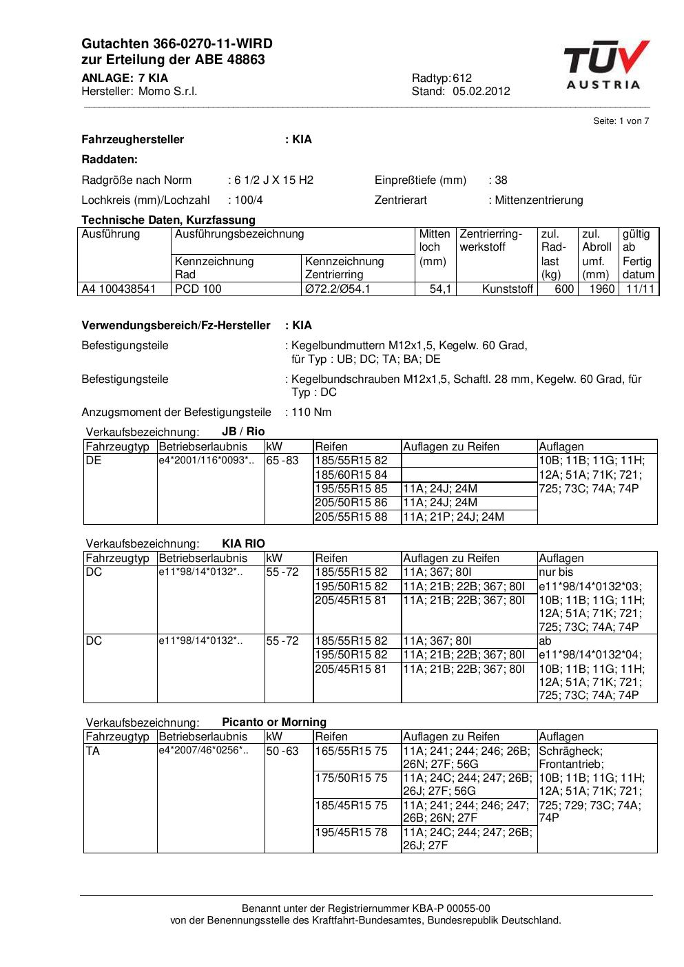 Dieses Gutachten (abe) bezieht sich auf die Alufelge Momo 612 in der Ausführung 2Jx15 ET 0, Mittenloch 0 mm (KBA 48863). Im PDF findest du typischerweise zulässige Reifengrößen, Auflagen/Anbauhinweise und – je nach Dokument – Hinweise zur Eintragung.