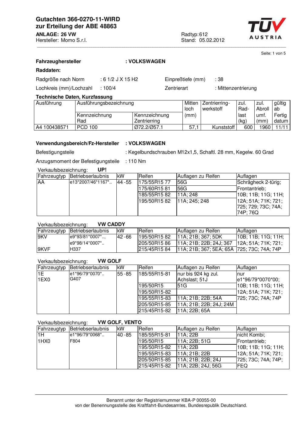 Dieses Gutachten (abe) bezieht sich auf die Alufelge Momo 612 in der Ausführung 2Jx15 ET 0, Mittenloch 0 mm (KBA 48863). Im PDF findest du typischerweise zulässige Reifengrößen, Auflagen/Anbauhinweise und – je nach Dokument – Hinweise zur Eintragung.