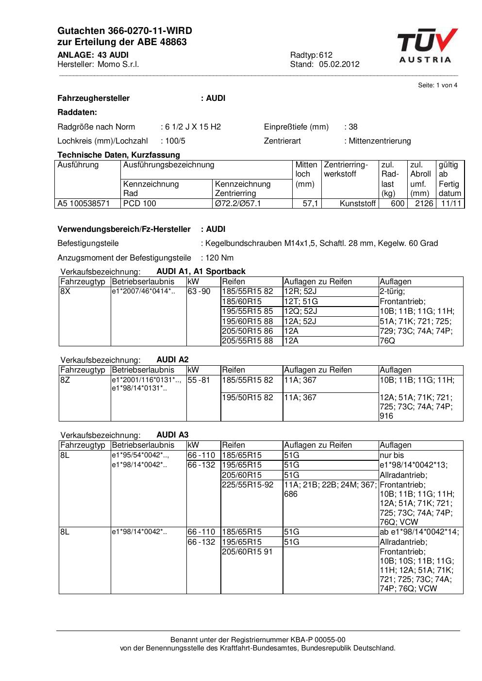 Dieses Gutachten (abe) bezieht sich auf die Alufelge Momo 612 in der Ausführung 2Jx15 ET 0, Mittenloch 0 mm (KBA 48863). Im PDF findest du typischerweise zulässige Reifengrößen, Auflagen/Anbauhinweise und – je nach Dokument – Hinweise zur Eintragung.