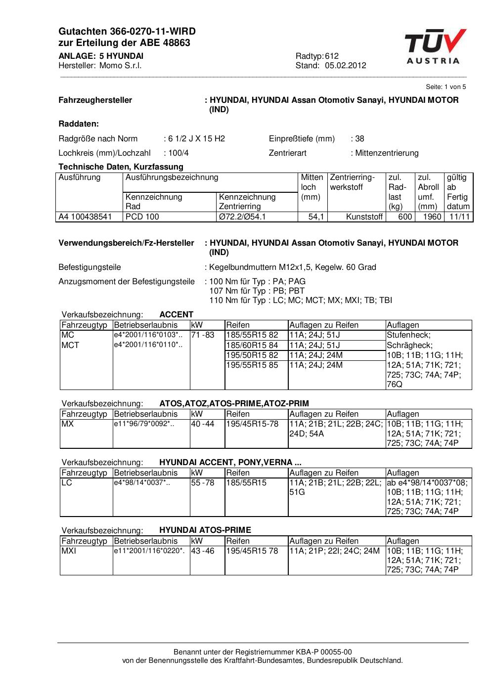 Dieses Gutachten (abe) bezieht sich auf die Alufelge Momo 612 in der Ausführung 2Jx15 ET 0, Mittenloch 0 mm (KBA 48863). Im PDF findest du typischerweise zulässige Reifengrößen, Auflagen/Anbauhinweise und – je nach Dokument – Hinweise zur Eintragung.