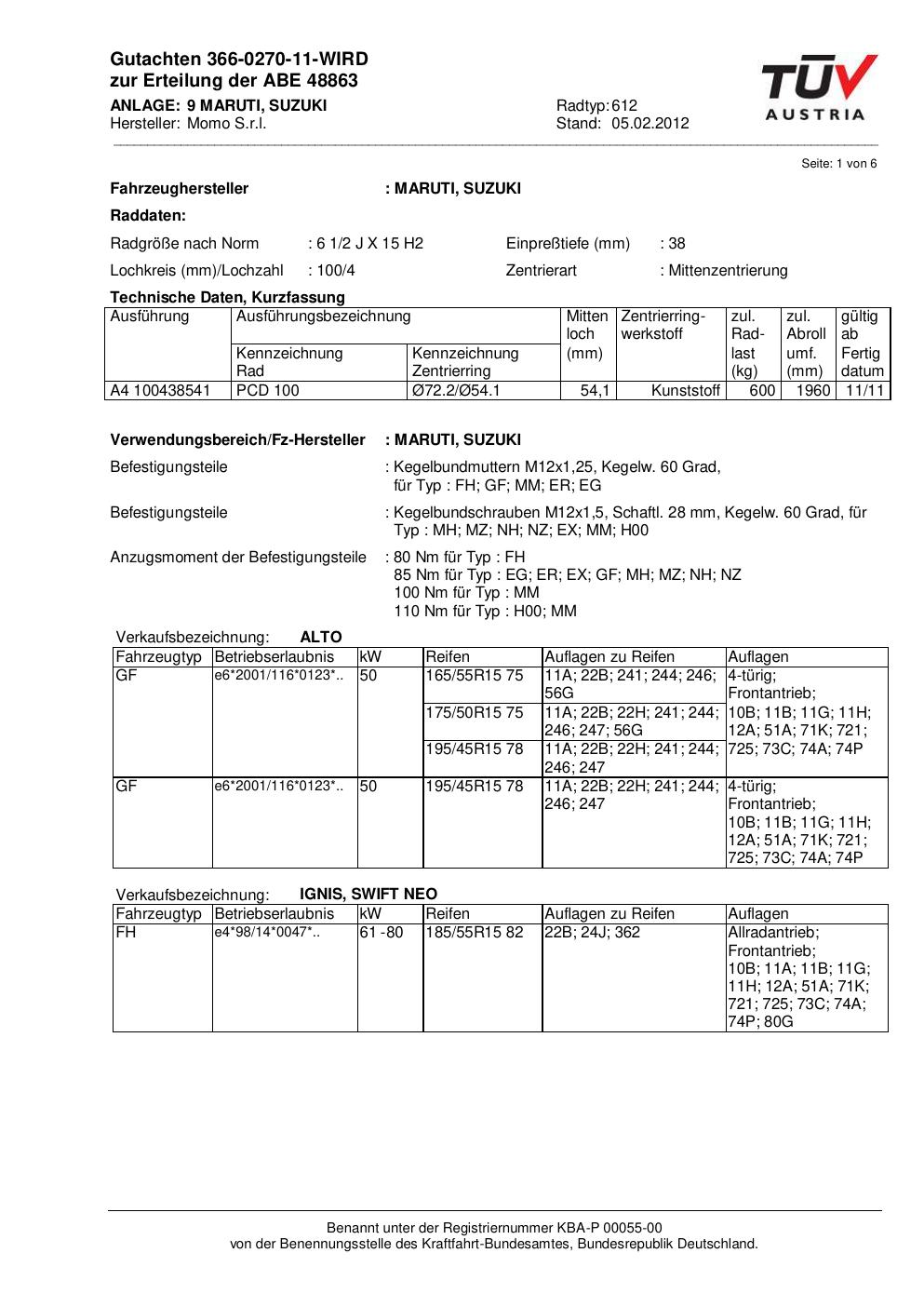 Dieses Gutachten (abe) bezieht sich auf die Alufelge Momo 612 in der Ausführung 2Jx15 ET 0, Mittenloch 0 mm (KBA 48863). Im PDF findest du typischerweise zulässige Reifengrößen, Auflagen/Anbauhinweise und – je nach Dokument – Hinweise zur Eintragung.