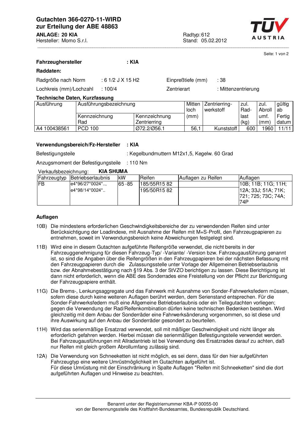 Dieses Gutachten (abe) bezieht sich auf die Alufelge Momo 612 in der Ausführung 2Jx15 ET 0, Mittenloch 0 mm (KBA 48863). Im PDF findest du typischerweise zulässige Reifengrößen, Auflagen/Anbauhinweise und – je nach Dokument – Hinweise zur Eintragung.