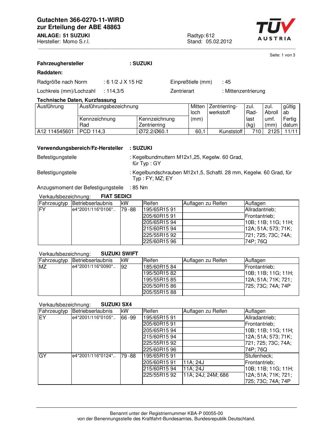 Dieses Gutachten (abe) bezieht sich auf die Alufelge Momo 612 in der Ausführung 2Jx15 ET 0, Mittenloch 0 mm (KBA 48863). Im PDF findest du typischerweise zulässige Reifengrößen, Auflagen/Anbauhinweise und – je nach Dokument – Hinweise zur Eintragung.