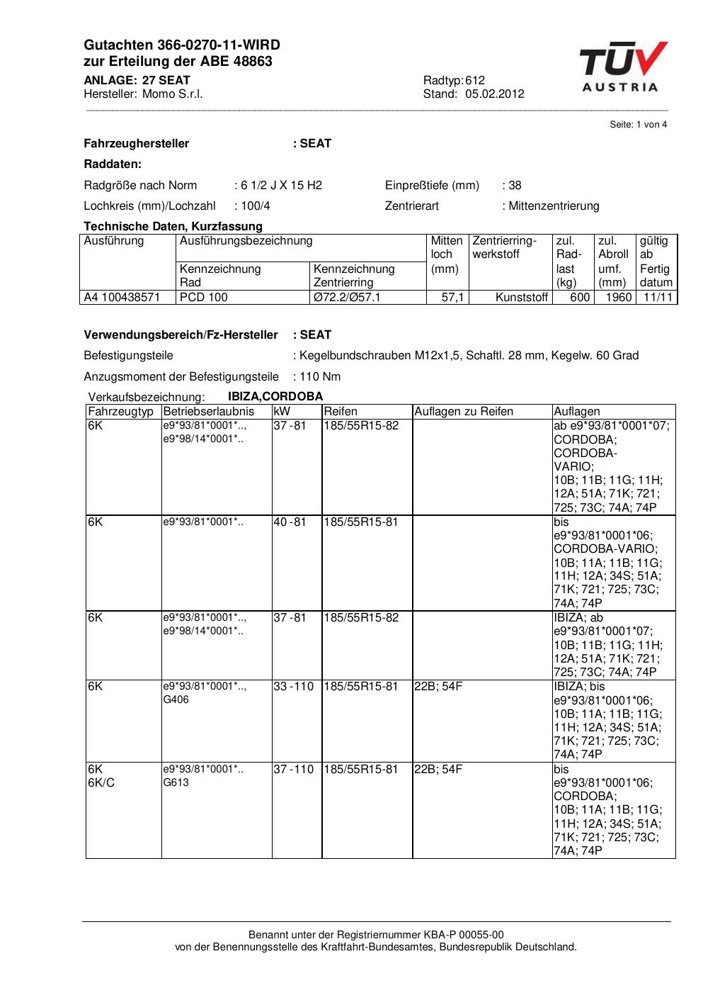 Dieses Gutachten (abe) bezieht sich auf die Alufelge Momo 612 in der Ausführung 2Jx15 ET 0, Mittenloch 0 mm (KBA 48863). Im PDF findest du typischerweise zulässige Reifengrößen, Auflagen/Anbauhinweise und – je nach Dokument – Hinweise zur Eintragung.