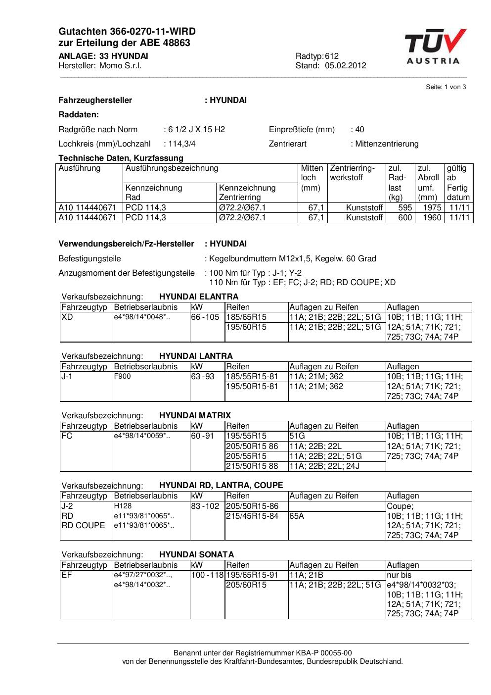 Dieses Gutachten (abe) bezieht sich auf die Alufelge Momo 612 in der Ausführung 2Jx15 ET 0, Mittenloch 0 mm (KBA 48863). Im PDF findest du typischerweise zulässige Reifengrößen, Auflagen/Anbauhinweise und – je nach Dokument – Hinweise zur Eintragung.