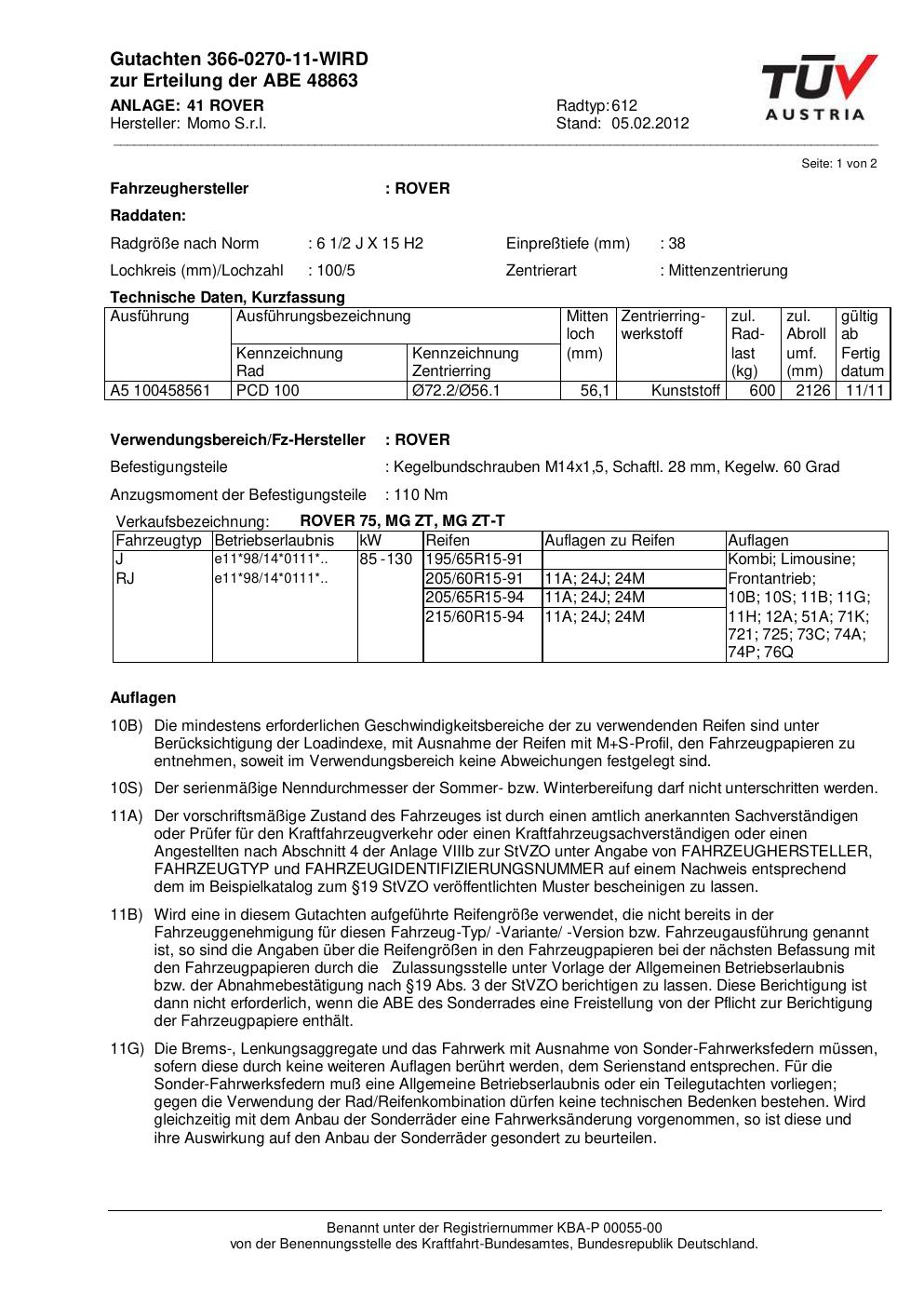 Dieses Gutachten (abe) bezieht sich auf die Alufelge Momo 612 in der Ausführung 2Jx15 ET 0, Mittenloch 0 mm (KBA 48863). Im PDF findest du typischerweise zulässige Reifengrößen, Auflagen/Anbauhinweise und – je nach Dokument – Hinweise zur Eintragung.