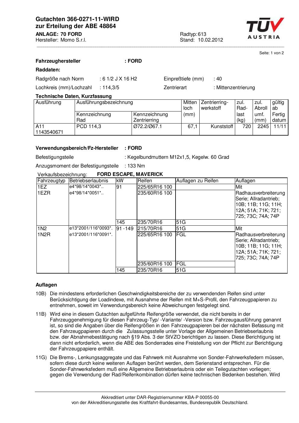 Dieses Gutachten (abe) bezieht sich auf die Alufelge Momo 613 in der Ausführung 2Jx16 ET 0, Mittenloch 0 mm (KBA 48864). Im PDF findest du typischerweise zulässige Reifengrößen, Auflagen/Anbauhinweise und – je nach Dokument – Hinweise zur Eintragung.